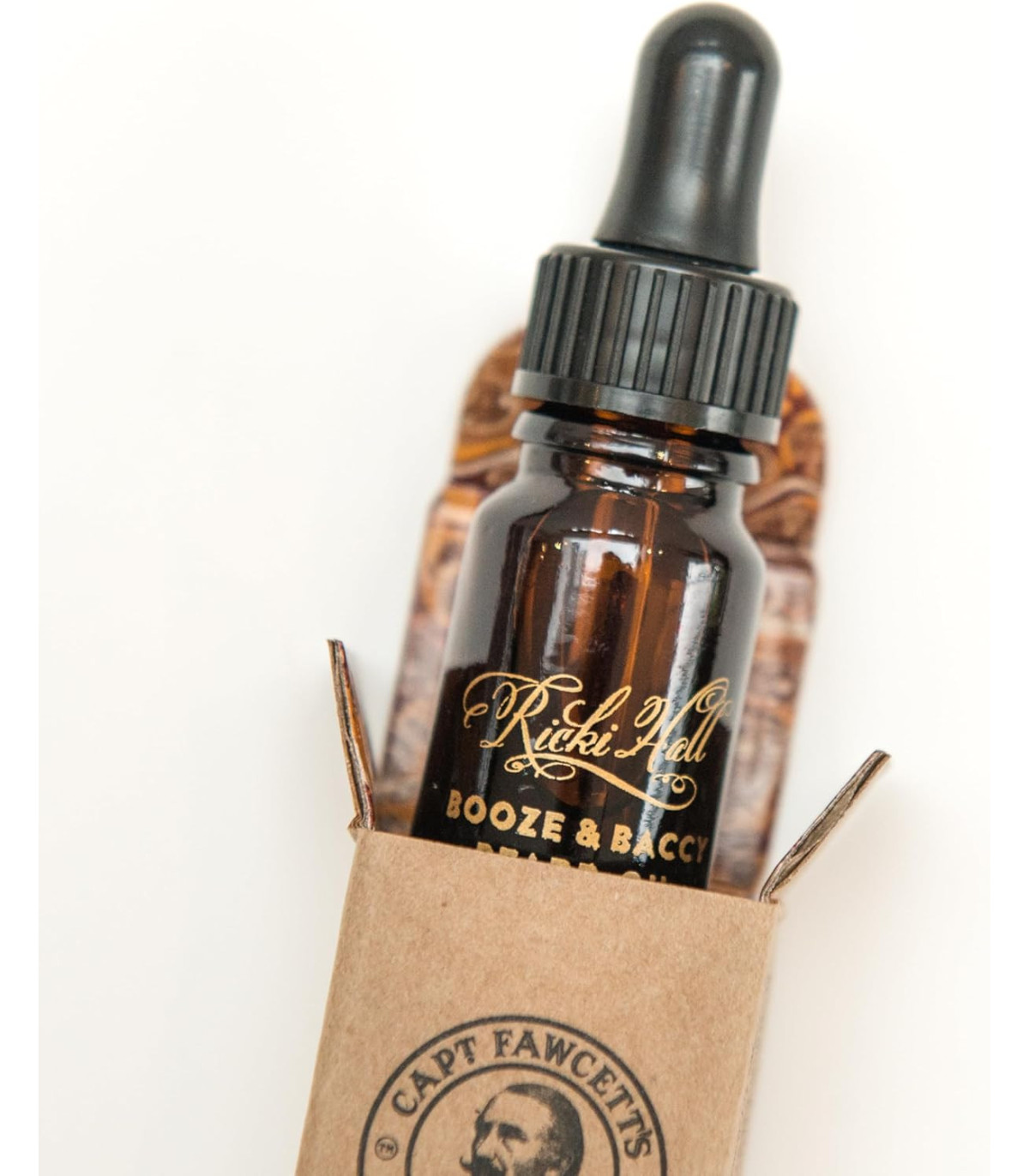 El aceite para barba Booze & Baccy de Captain Fawcett, en tamaño viaje de 10ml, combina lujo y funcionalidad en cada gota.