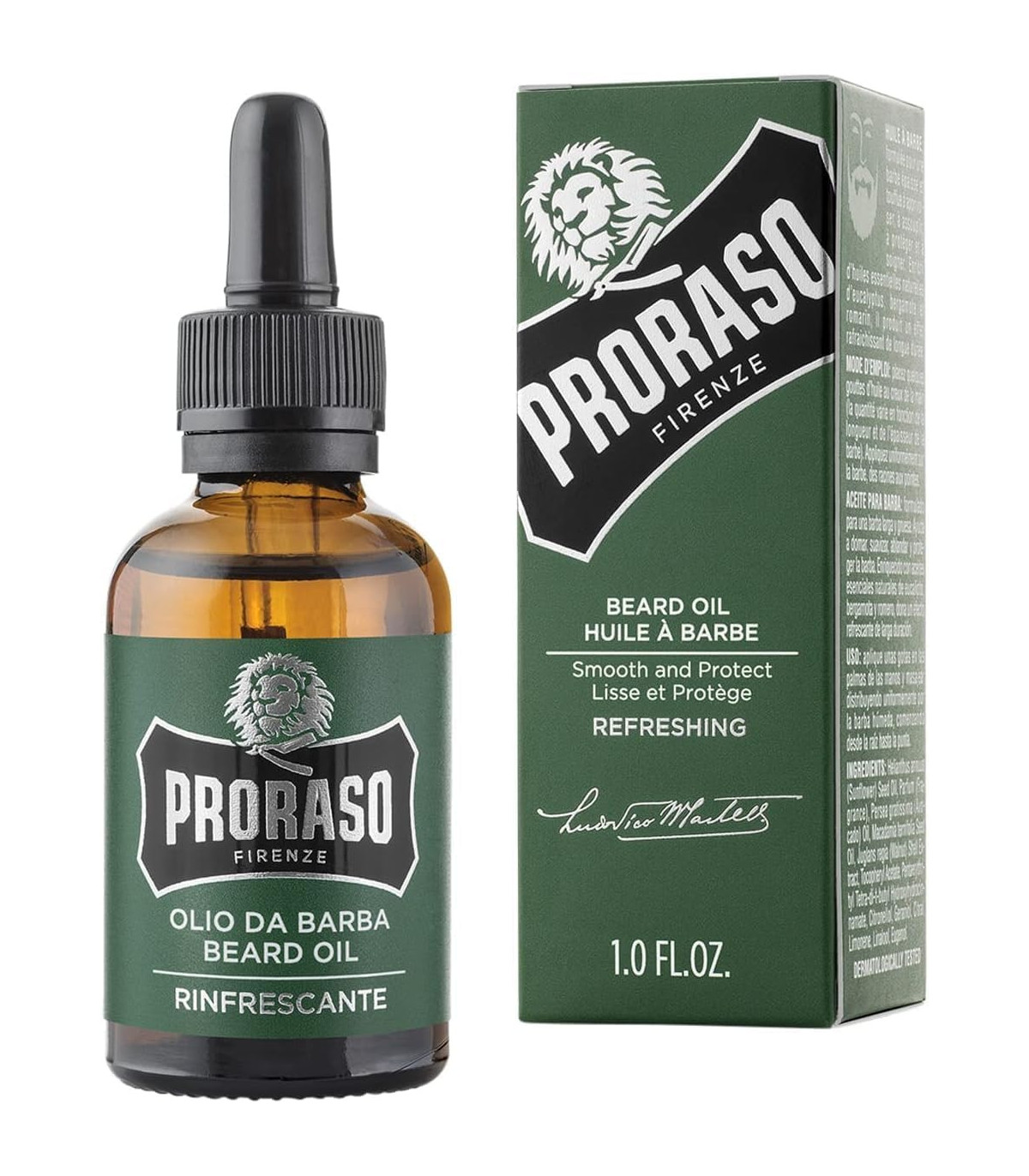 El Aceite para la Barba Proraso Refrescante está formulado sin siliconas y enriquecido con aceites de macadamia y aguacate, que penetran en profundidad para nutrir, suavizar y proteger el vello facial.