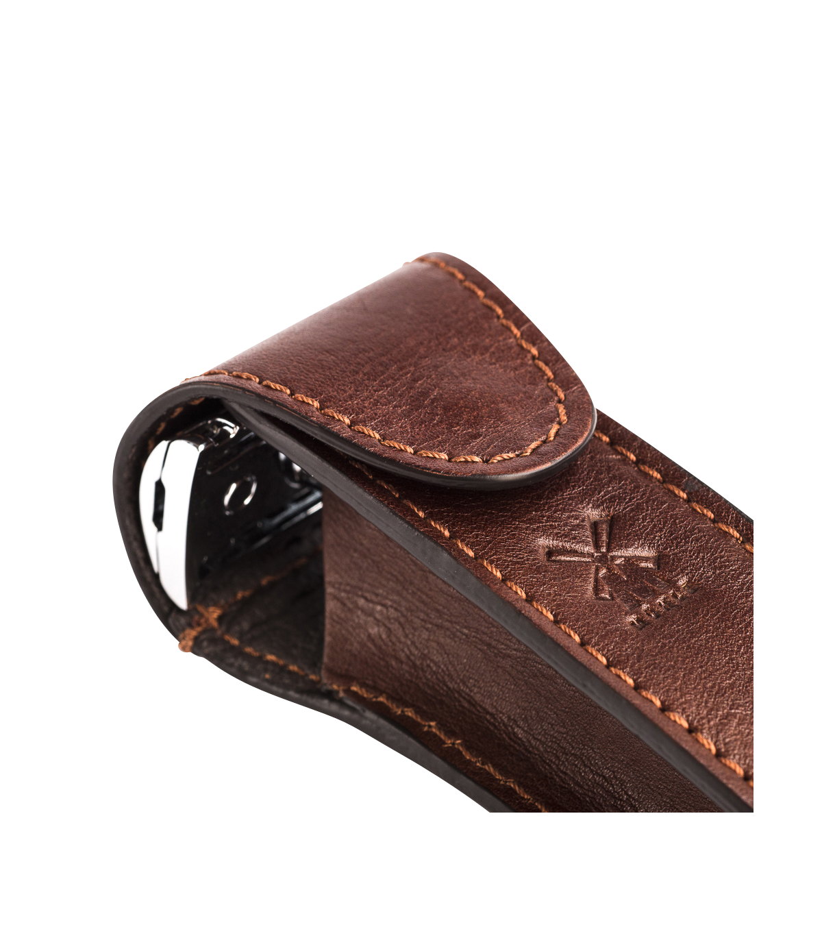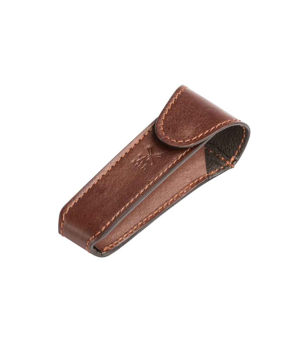La funda de cuero marrón MÜHLE para maquinillas de afeitar clásicas está diseñada para proteger tu herramienta durante el transporte, manteniendo su estado y facilitando su uso en viajes o desplazamientos.