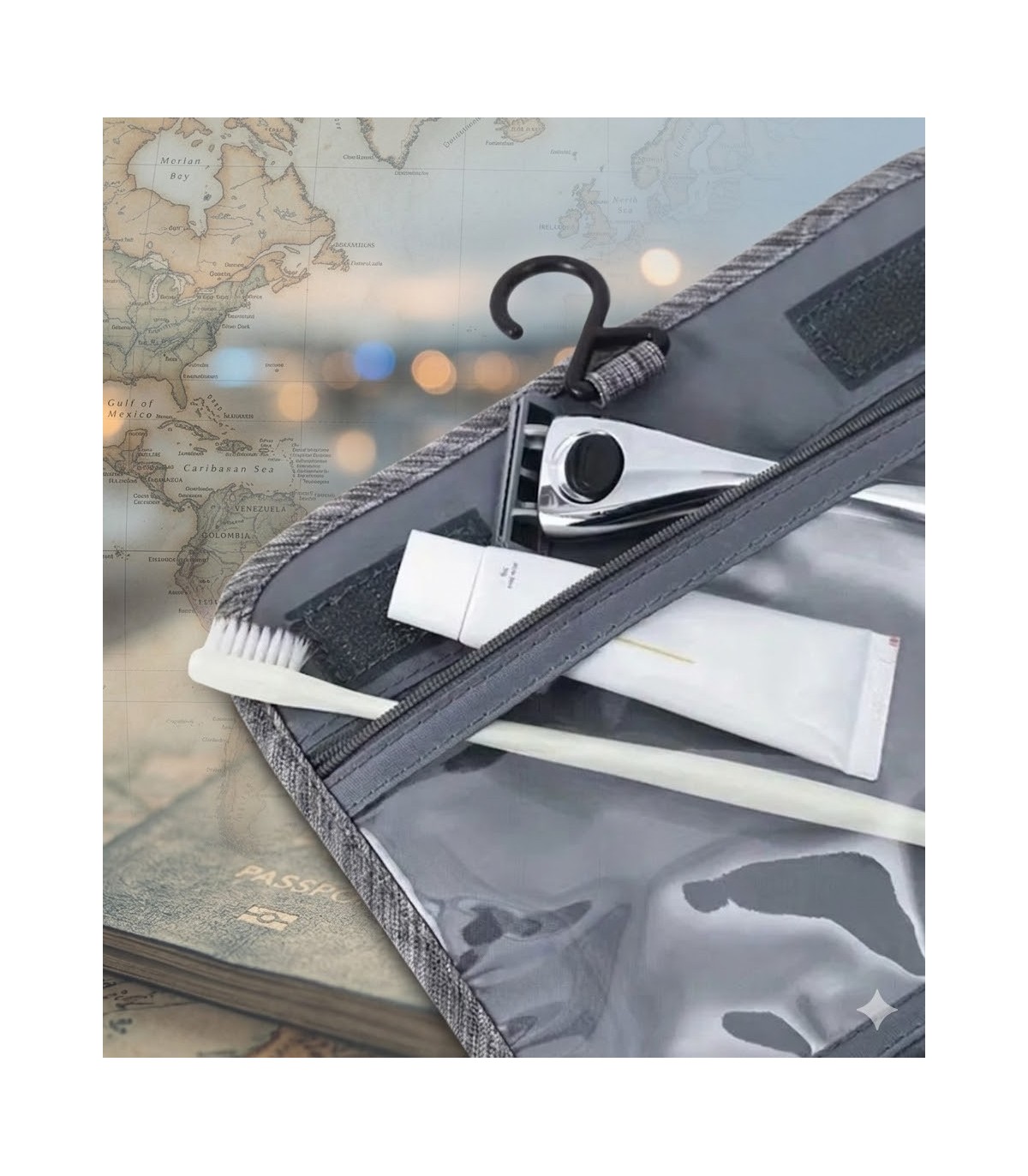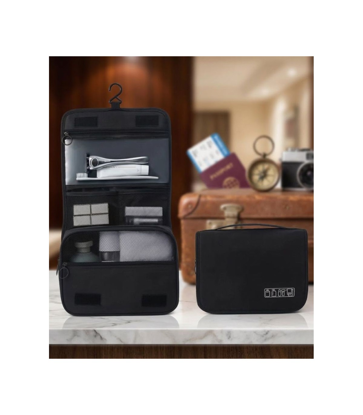 El gancho integrado permite colgar el neceser en percheros, puertas o toalleros, facilitando el acceso a todo el contenido sin necesidad de ocupar espacio en la encimera. Esta característica es especialmente útil en baños pequeños, hoteles o gimnasios.