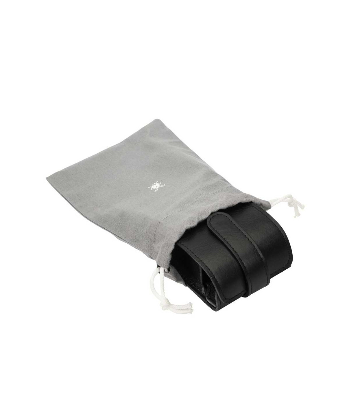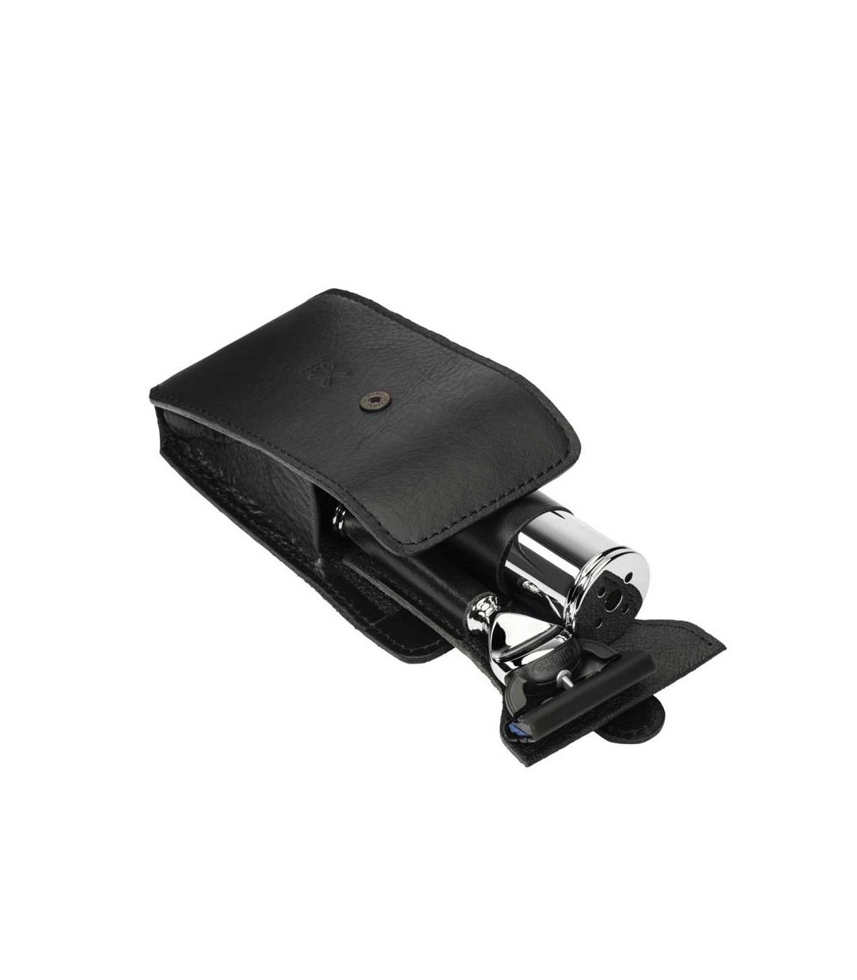 El conjunto se presenta en un estuche de piel negra, fabricado en cuero de vacuno con curtido vegetal. Su formato compacto protege los elementos del kit y facilita su transporte en neceser o equipaje.