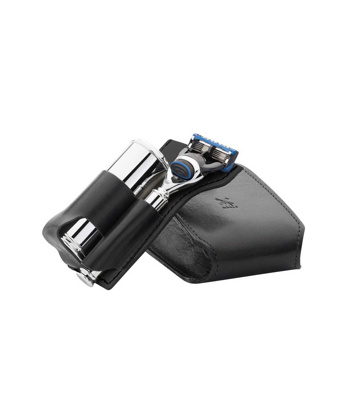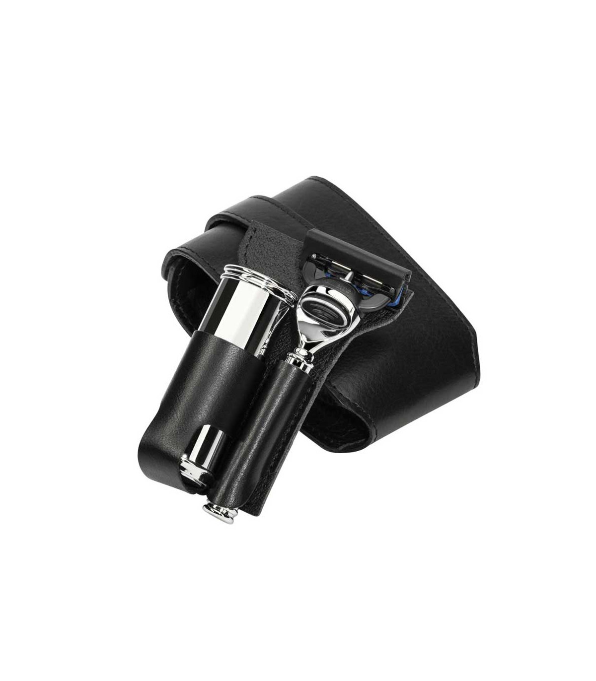 El kit de viaje MÜHLE con maquinilla Fusion y brocha Silvertip Fibre® en estuche de piel negra está pensado para quienes buscan un afeitado rápido, cómodo y bien organizado durante sus desplazamientos.