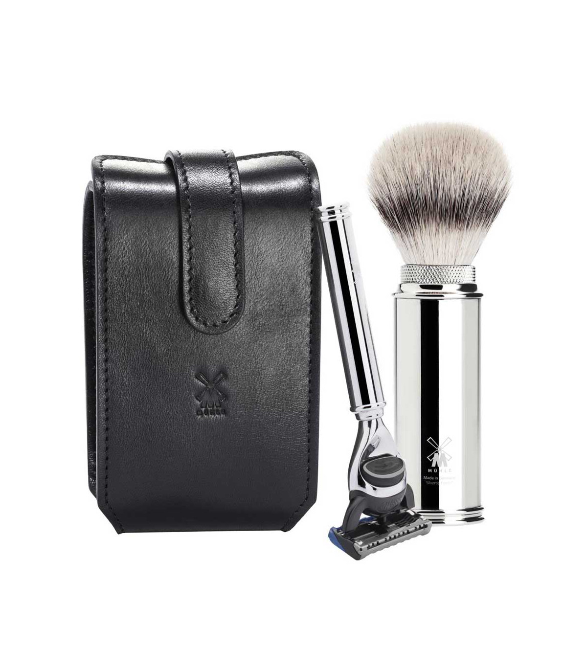 Kit Viaje Afeitado MÜHLE Fusion + Brocha Fibra Piel Negra