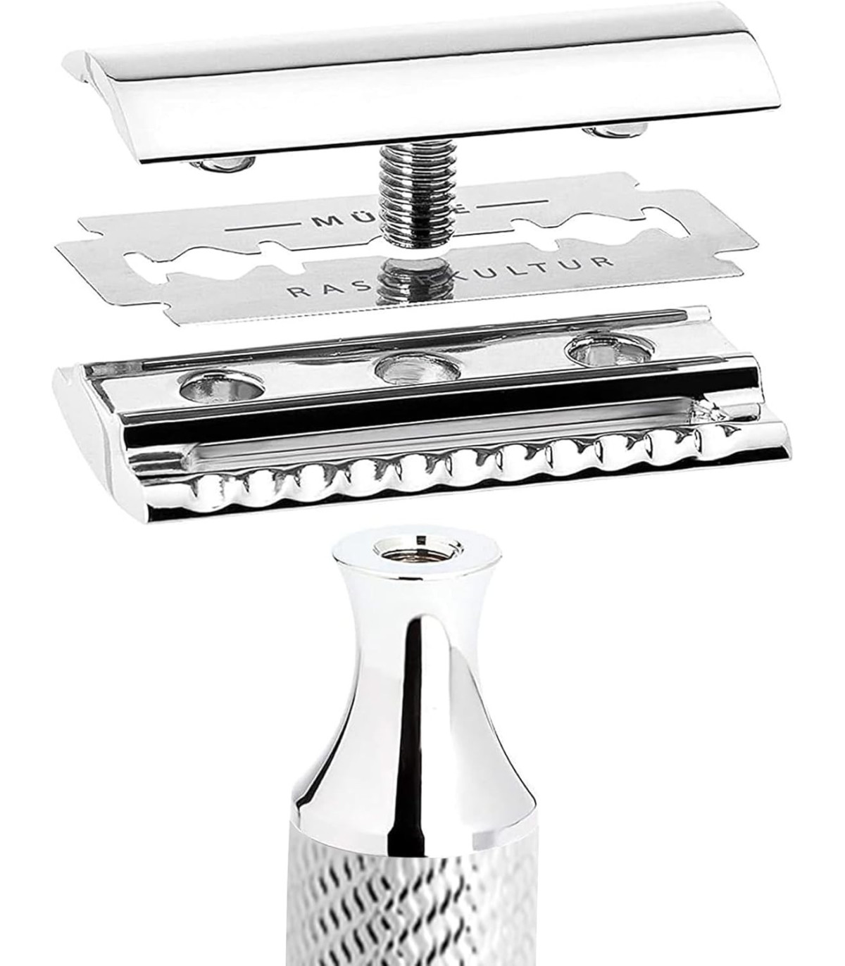 ¿Qué hojas son compatibles y cómo cambiarlas?Utiliza cualquier hoja estándar de doble filo. El cambio es seguro: desenrosca la cabeza, coloca la hoja y vuelve a cerrar. Mühle recomienda cambio cada 3‑5 afeitados.