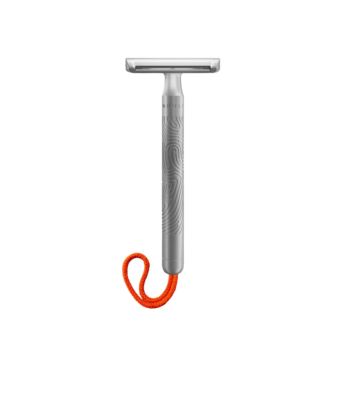 El mango, con una longitud de 112 mm, mejora el alcance y facilita el manejo en zonas amplias. En su extremo incorpora un cordón de algodón en color coral, que permite colgar la maquinilla tras su uso, favoreciendo el secado y el almacenamiento.