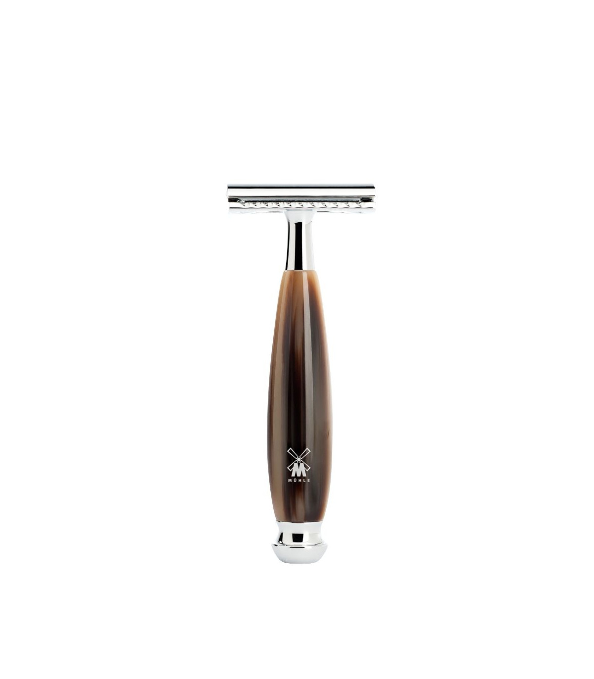 La Maquinilla de Afeitar MÜHLE Vivo Cuerno Marrón de Peine Cerrado combina la tradición del afeitado clásico con un diseño ergonómico pensado para facilitar el manejo.