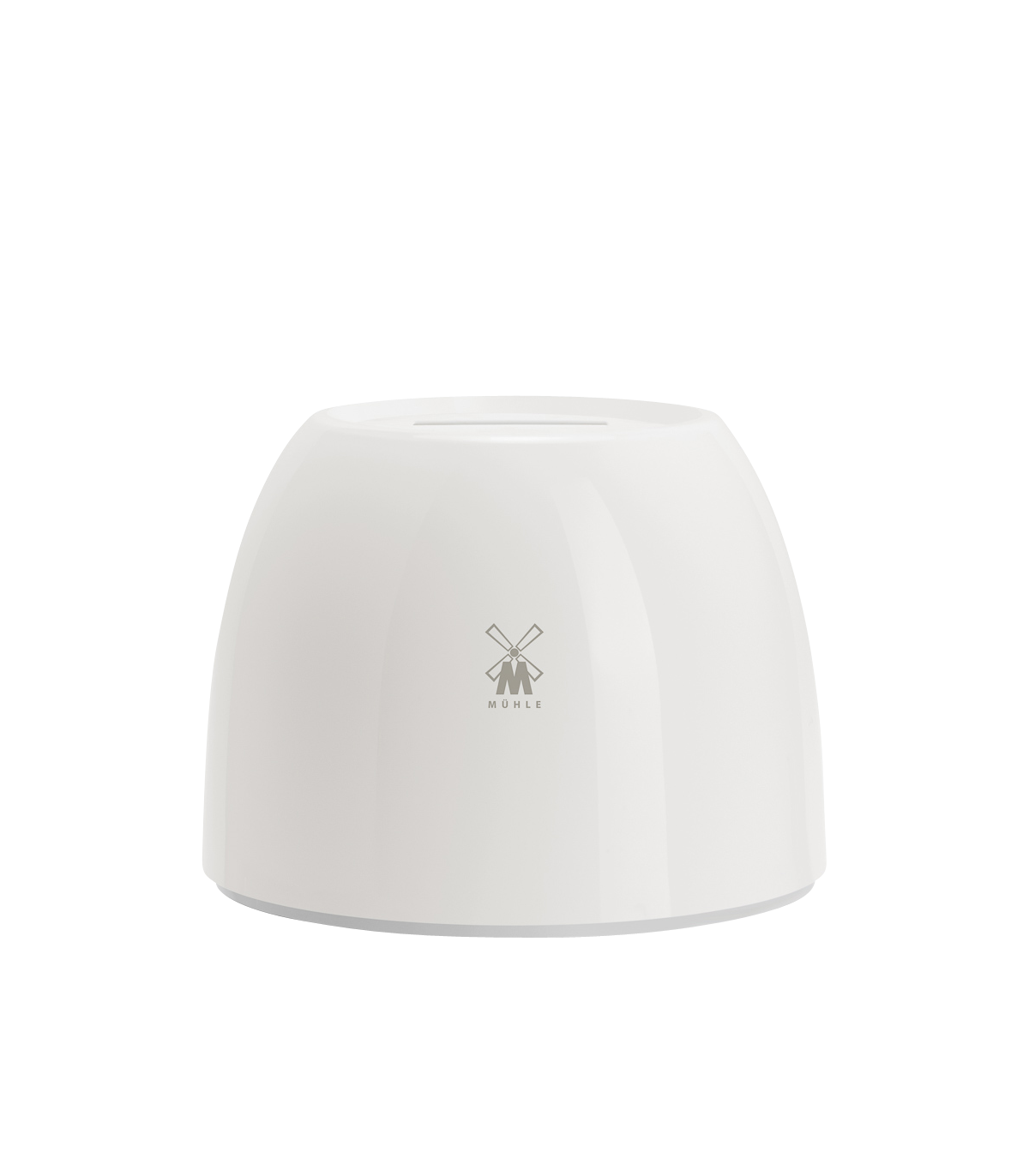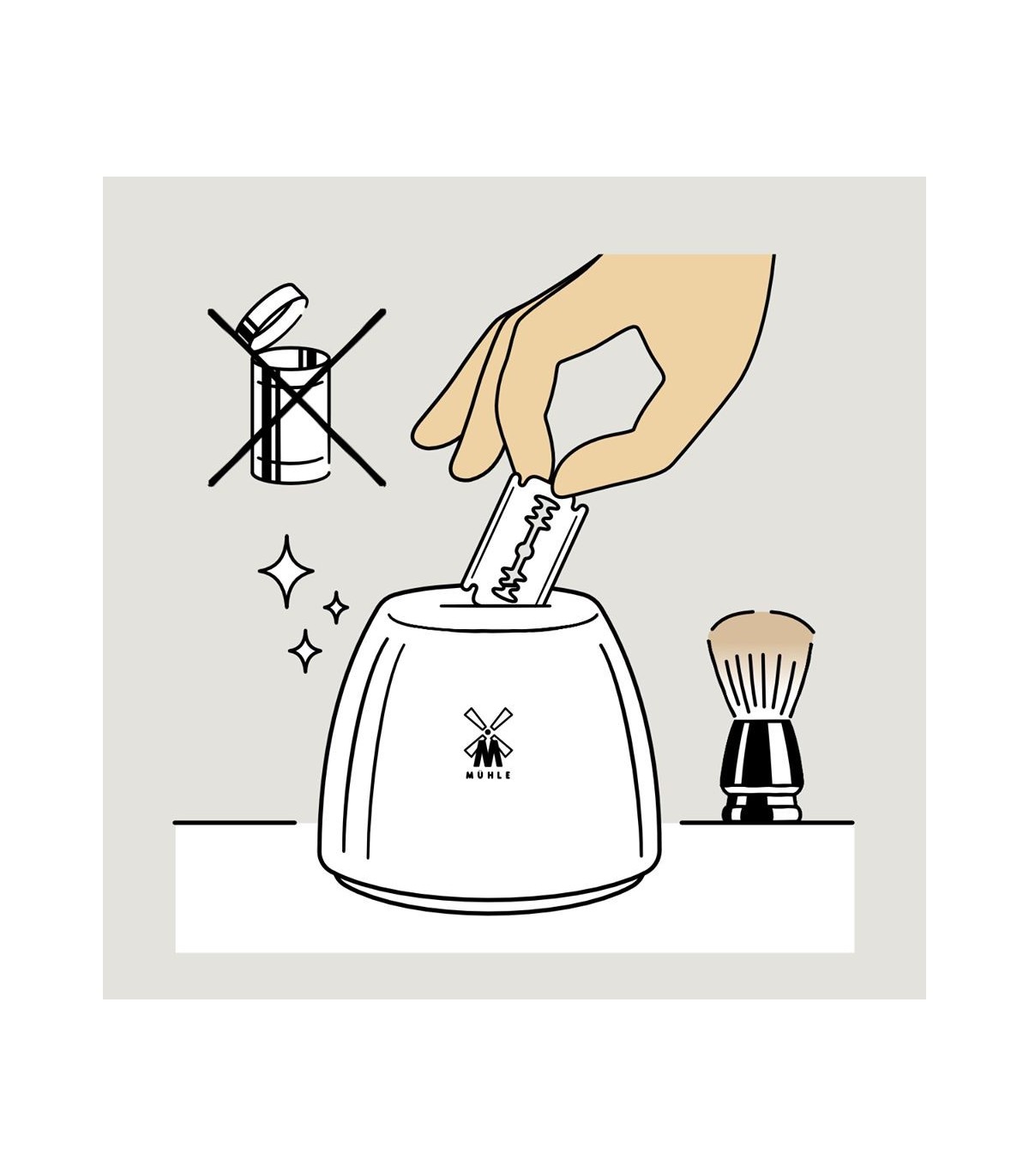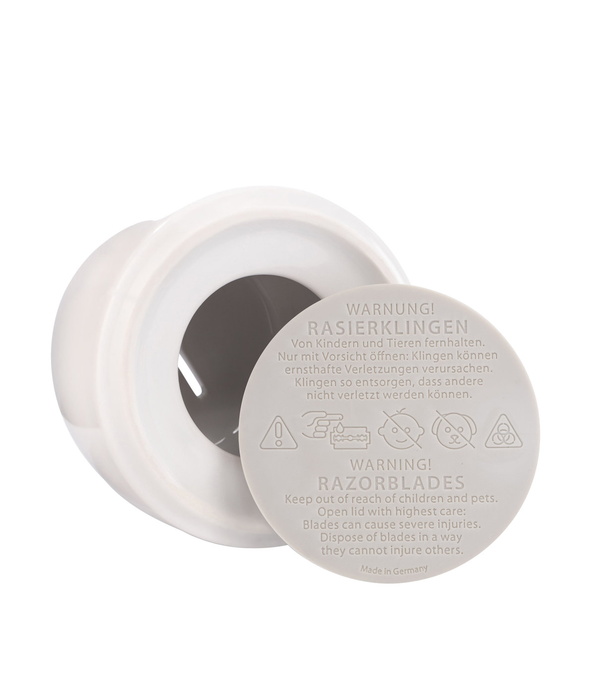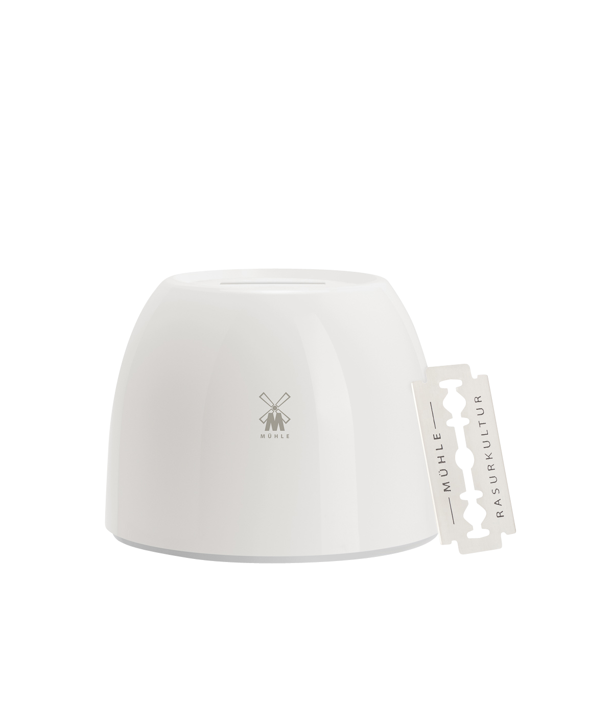 El recolector de cuchillas MÜHLE de porcelana está diseñado para almacenar de forma segura las cuchillas de afeitar usadas, evitando riesgos innecesarios en el hogar o en el entorno profesional.