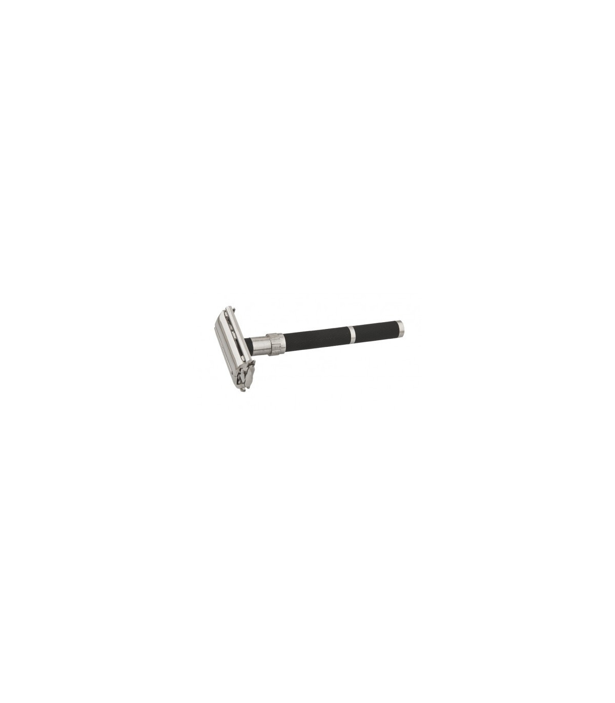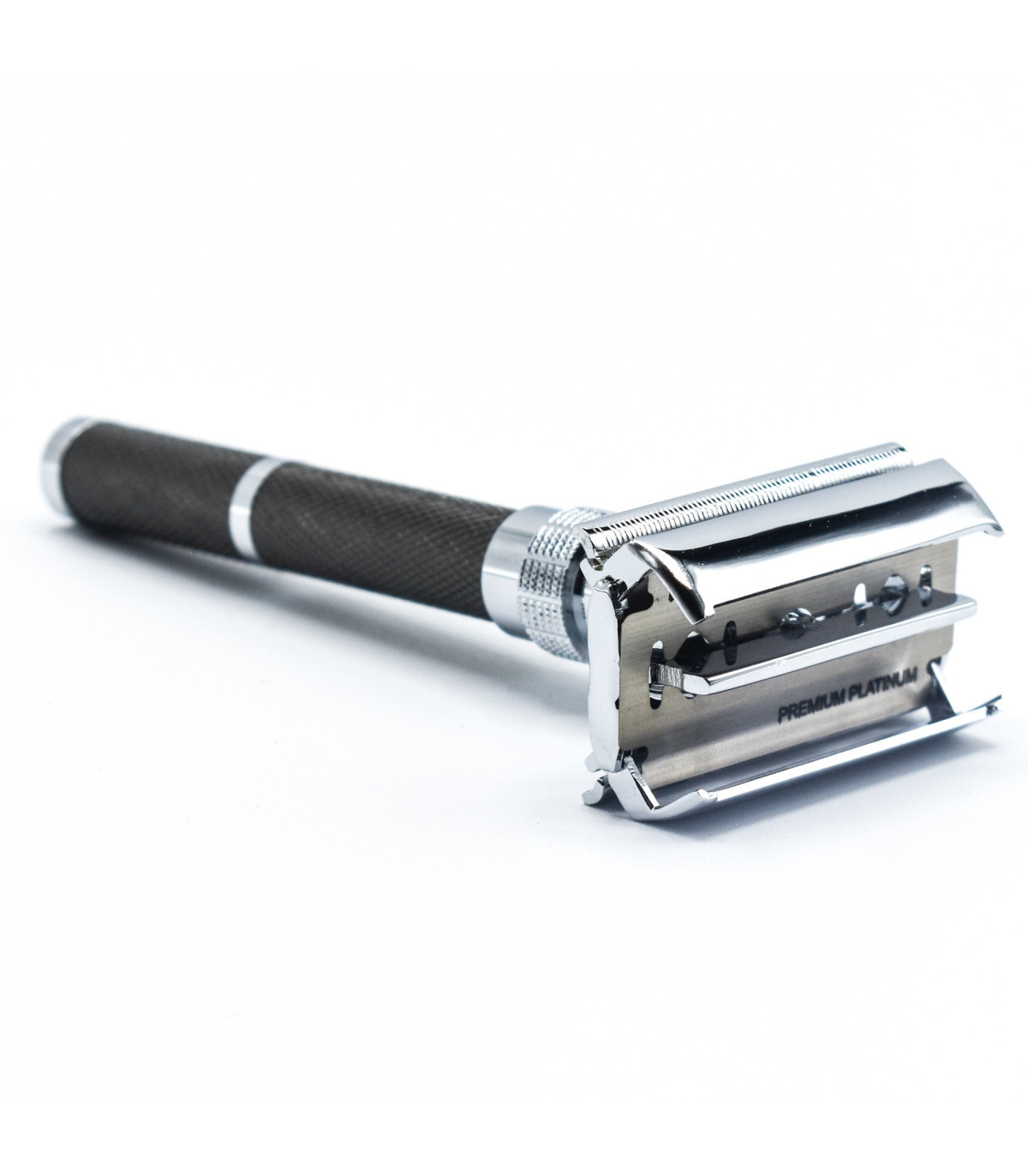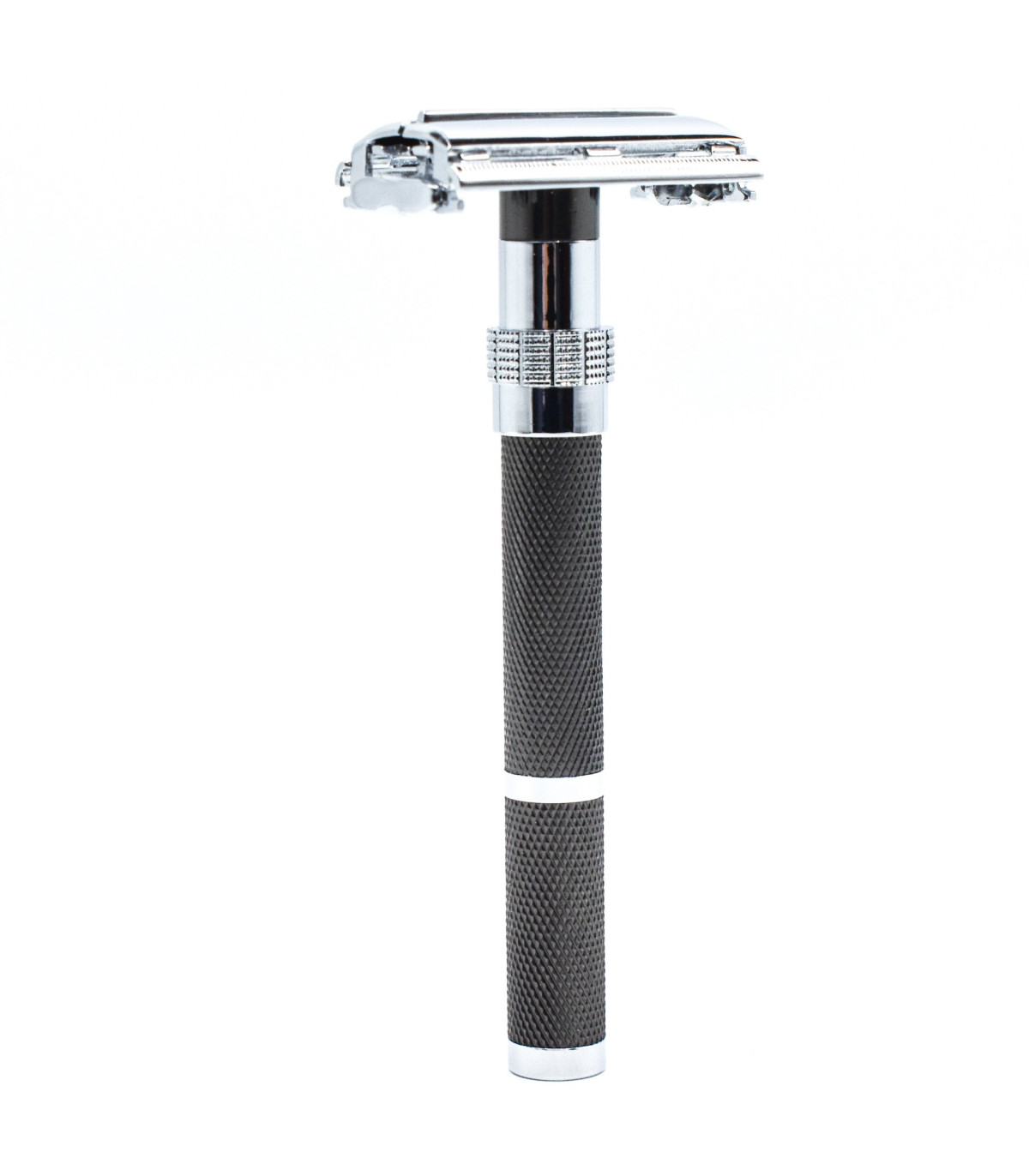 Fabricada en latón con un elegante acabado en grafito y cromo, esta maquinilla no solo es duradera, sino también resistente a la oxidación, asegurando que mantenga su brillo y eficacia con el tiempo