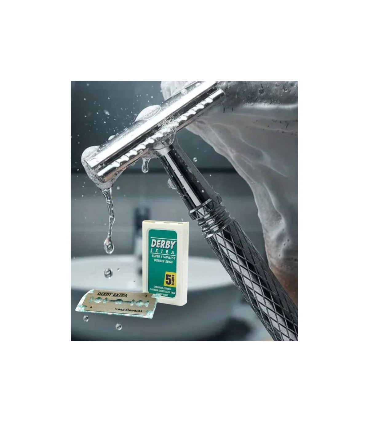 Presentación en caja y acompañada de 5 hojas de afeitar Derby Extra