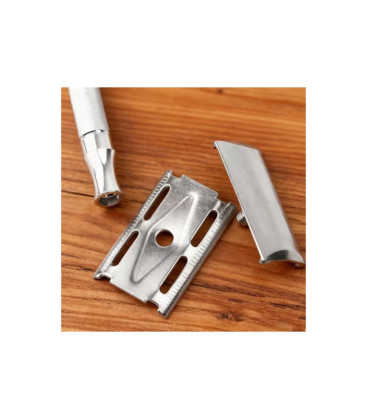 La Maquinilla de Afeitar Doble Filo Cromada Brillo de peine Cerrado SensaBien ha sido diseñada para quienes buscan un afeitado clásico eficaz, con materiales resistentes y un conjunto de accesorios que facilitan el uso diario y el mantenimiento.