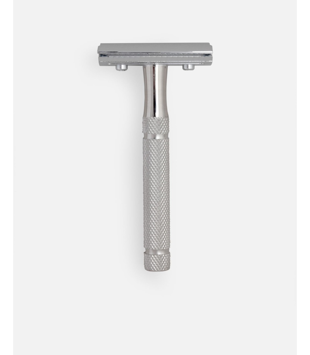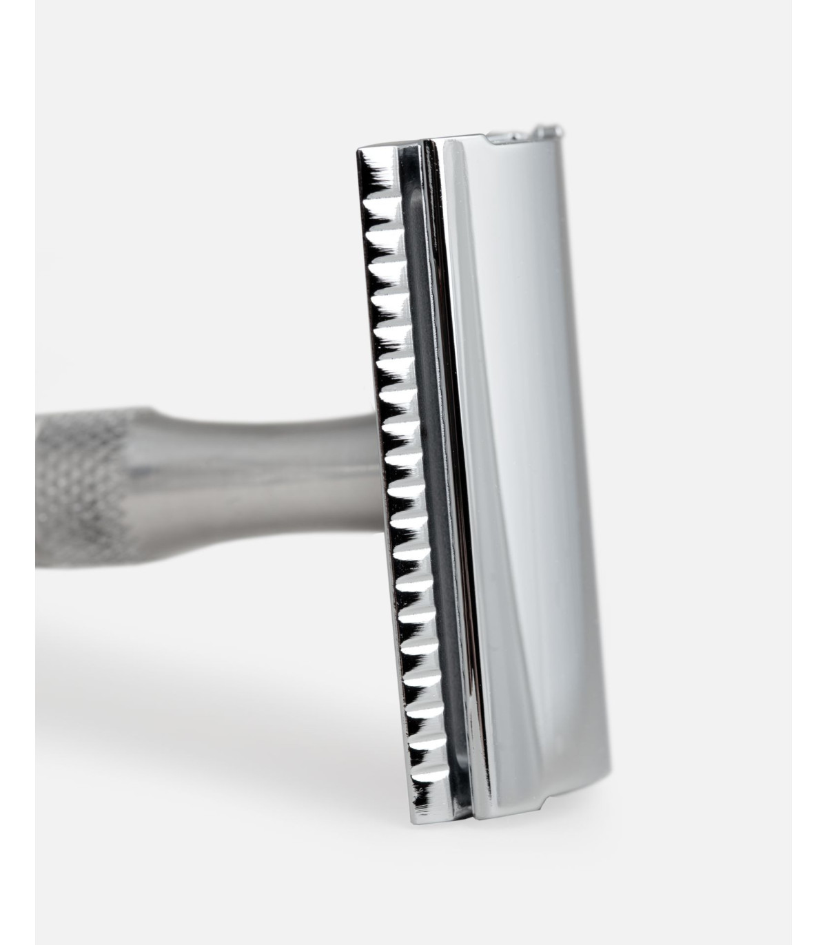 Maquinilla de afeitar clásica de tres piezas de la colección unisex Gentle Shaver con mango de acero inoxidable macizo de 80 mm de largo, con grabado rugoso para un manejo especialmente seguro. Incluye 1 hoja de afeitar Timor®