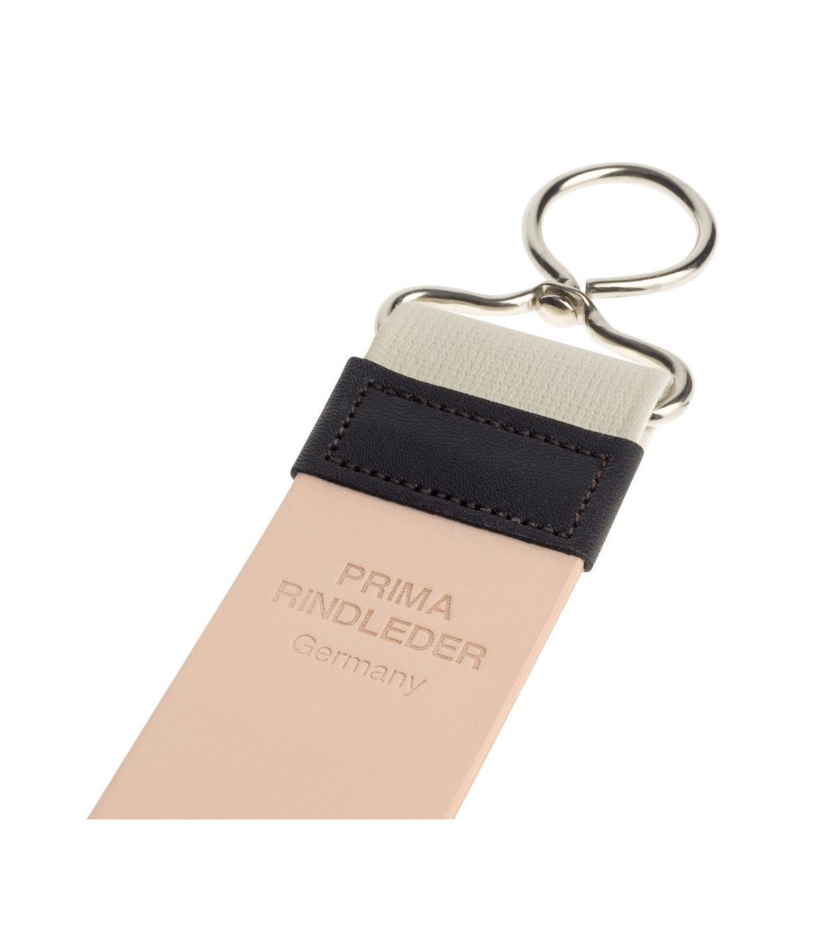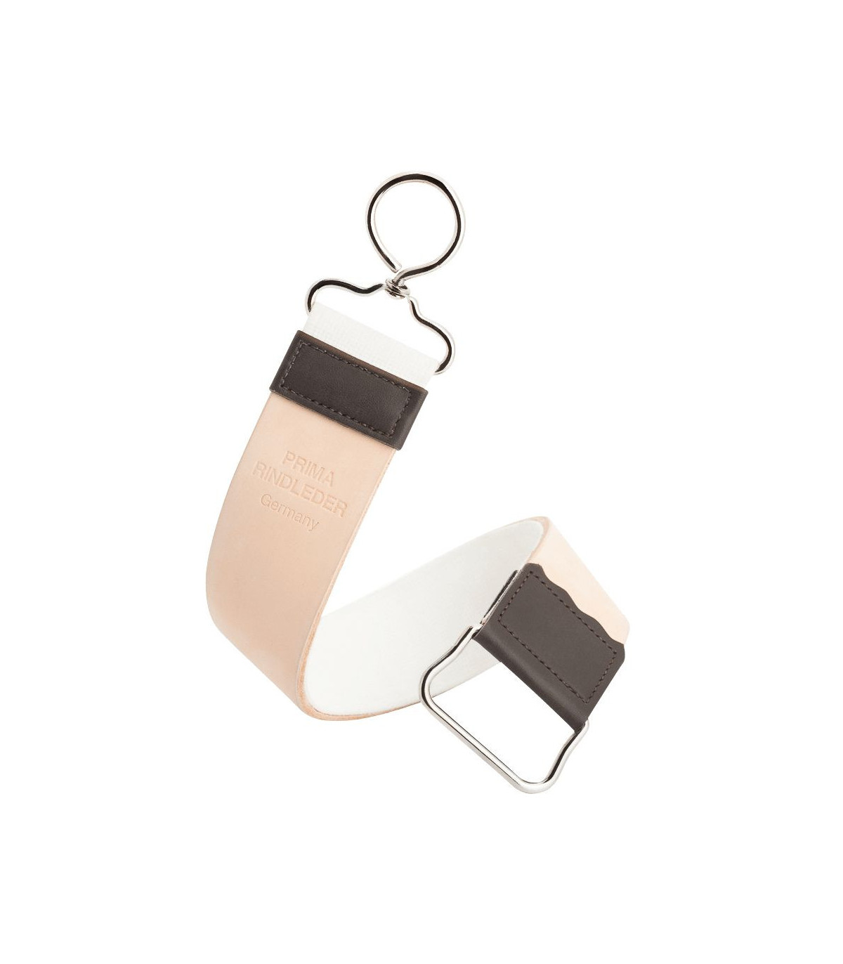 Asentador clásico MÜHLE con superficie de cuero natural y reverso textil resistente. Ideal para realinear el filo de navajas de afeitar rectas sin desgaste.