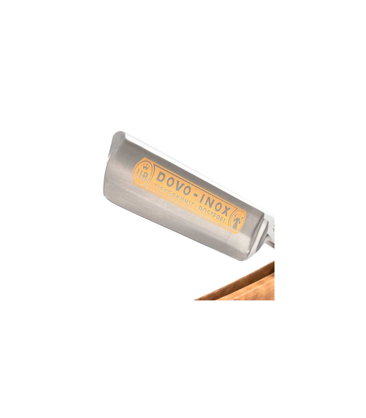 - Acero Inoxidable 1.4034: Esta navaja es una de las pocas de acero inoxidable de DOVO, especialmente diseñada para una resistencia superior a la corrosión causada por el jabón y el agua. La hoja se afila en múltiples etapas y lleva el grabado "DOVO INOX" en oro de 24 quilates, lo que garantiza un corte duradero y preciso.