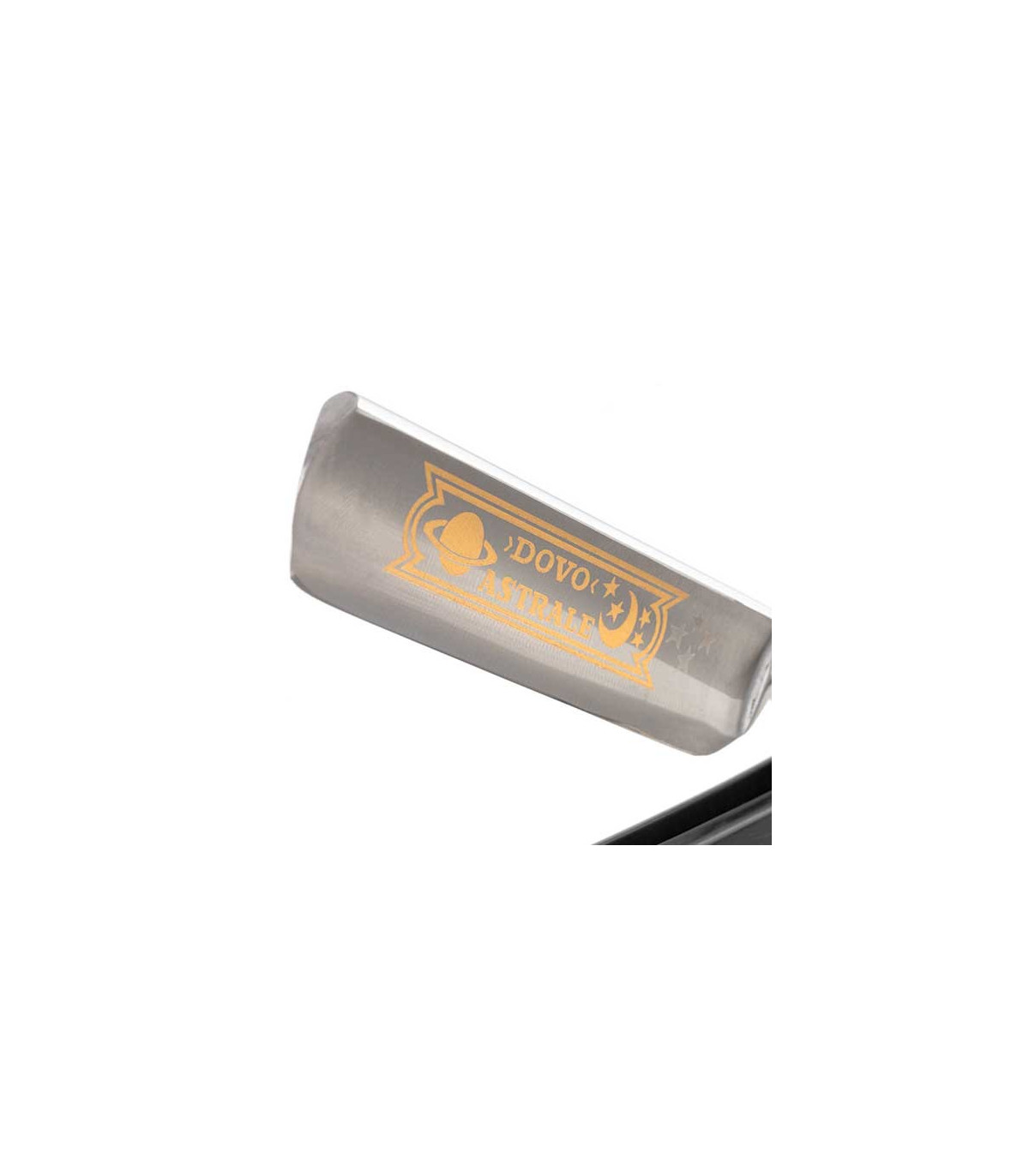 Las cachas están elaboradas en madera de ébano de color negro intenso, destacándose por su durabilidad y calidad superior. Un detalle único es la pequeña placa de alpaca en un lado de las cachas, que permite un grabado personalizado, ideal para quienes buscan darle un toque especial con su signo zodiacal o nombre. Además, la hoja lleva un grabado en oro de 24 quilates con el nombre "DOVO ASTRALE", que le añade un acabado de lujo.