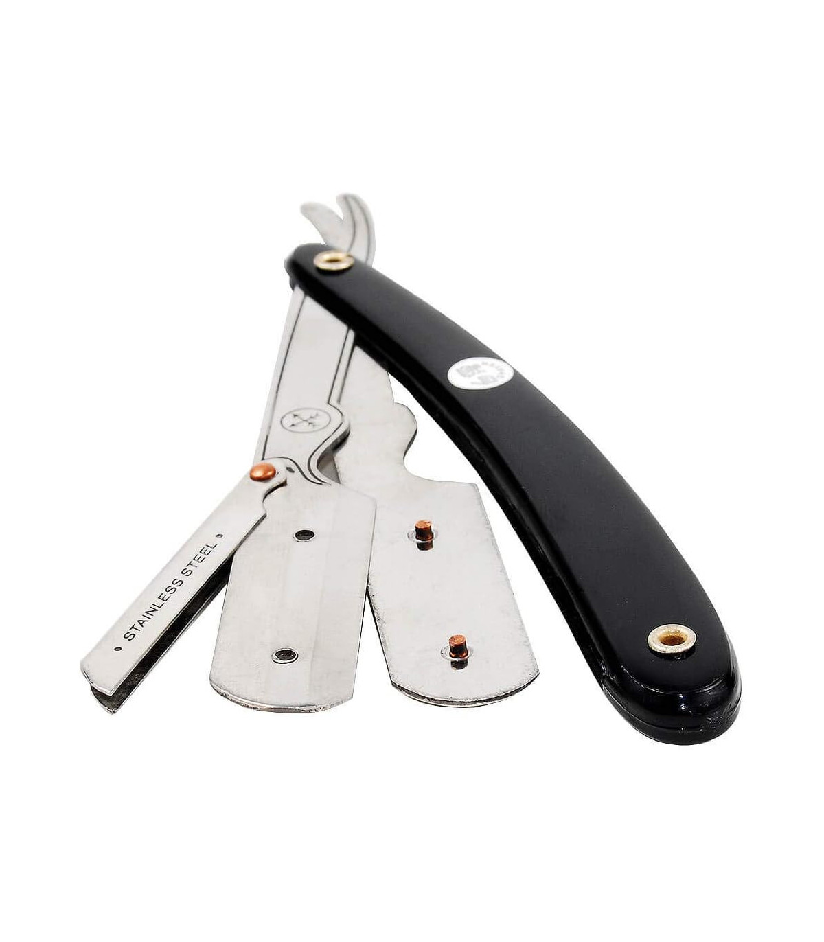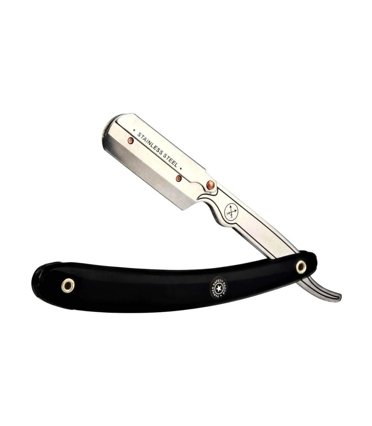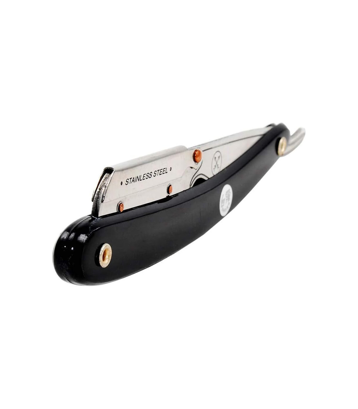 Es una herramienta de afeitado de alta calidad, diseñada tanto para profesionales como para entusiastas del afeitado en casa. Esta navaja se distingue por su robusta construcción en acero inoxidable, que garantiza durabilidad y un rendimiento superior a lo largo del tiempo. Su mango negro, elaborado en resina de alta calidad, no solo proporciona un agarre cómodo y seguro, sino que también añade un toque de sofisticación