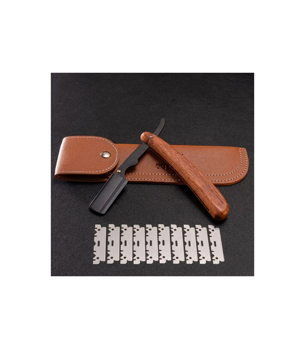 La funda de cuero sintético marrón claro, con cierre de botón a presión, protege la navaja de golpes y facilita su transporte, siendo ideal tanto para barberías como para uso personal o en viajes. Este set es una opción perfecta para quienes buscan un equipo de afeitado completo, elegante y funcional.