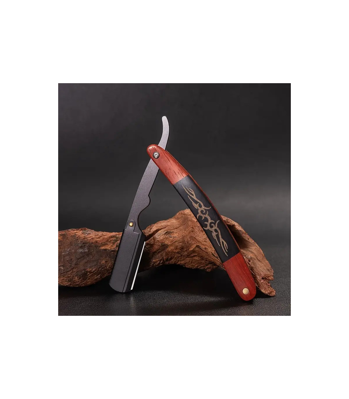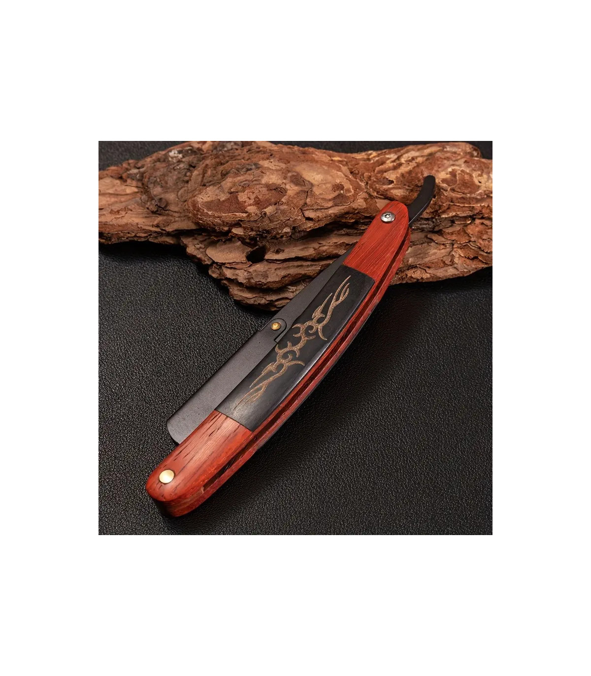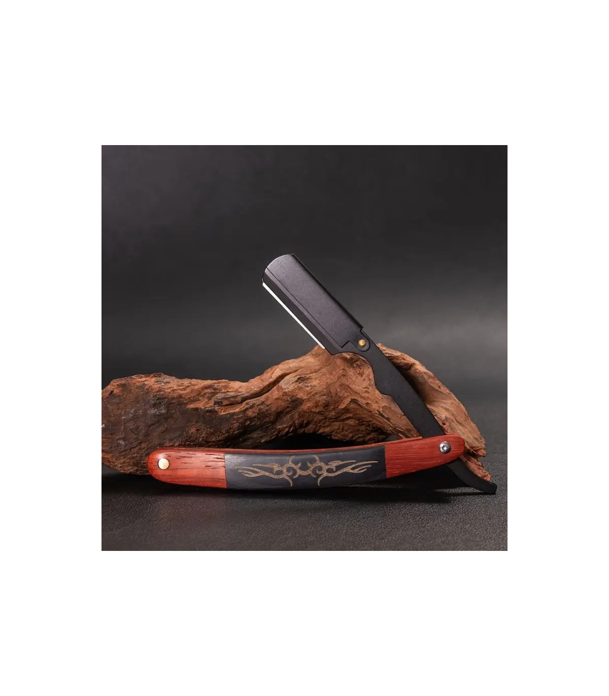 Su mango de madera de palisandro, trabajado con un tallado en relieve de color negro, no solo destaca por su belleza única, sino también por la sensación cálida y firme que aporta a la mano. Cada línea tallada convierte esta navaja en un accesorio con carácter propio, ideal para quienes buscan una herramienta de afeitado con estilo y personalidad.