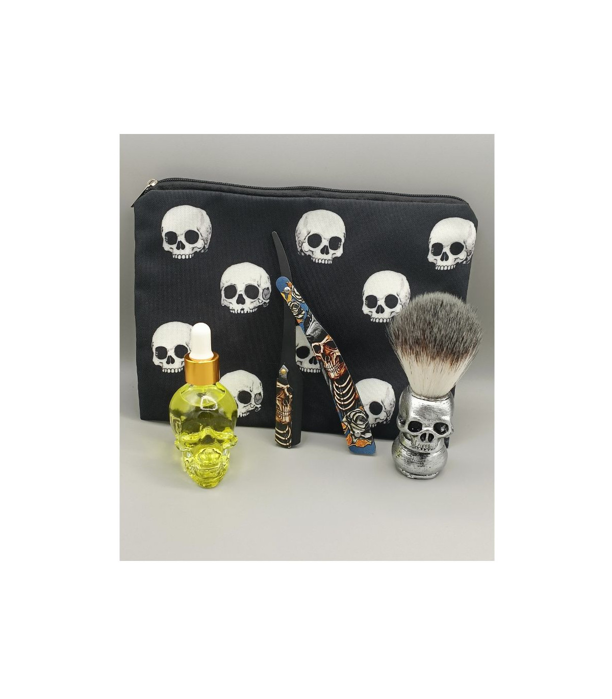 Todo el kit se presenta en un neceser con motivos de calavera, práctico, resistente y perfecto para llevarlo todo ordenado o para viajar.