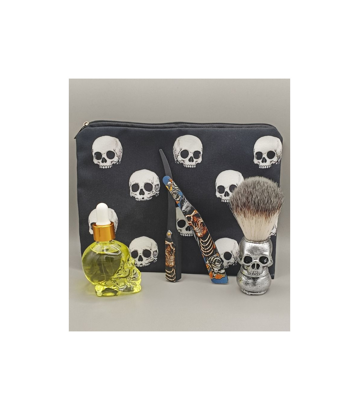 Incluye navaja calavera, brocha de cerda, aceite de barba con roller y neceser de regalo.