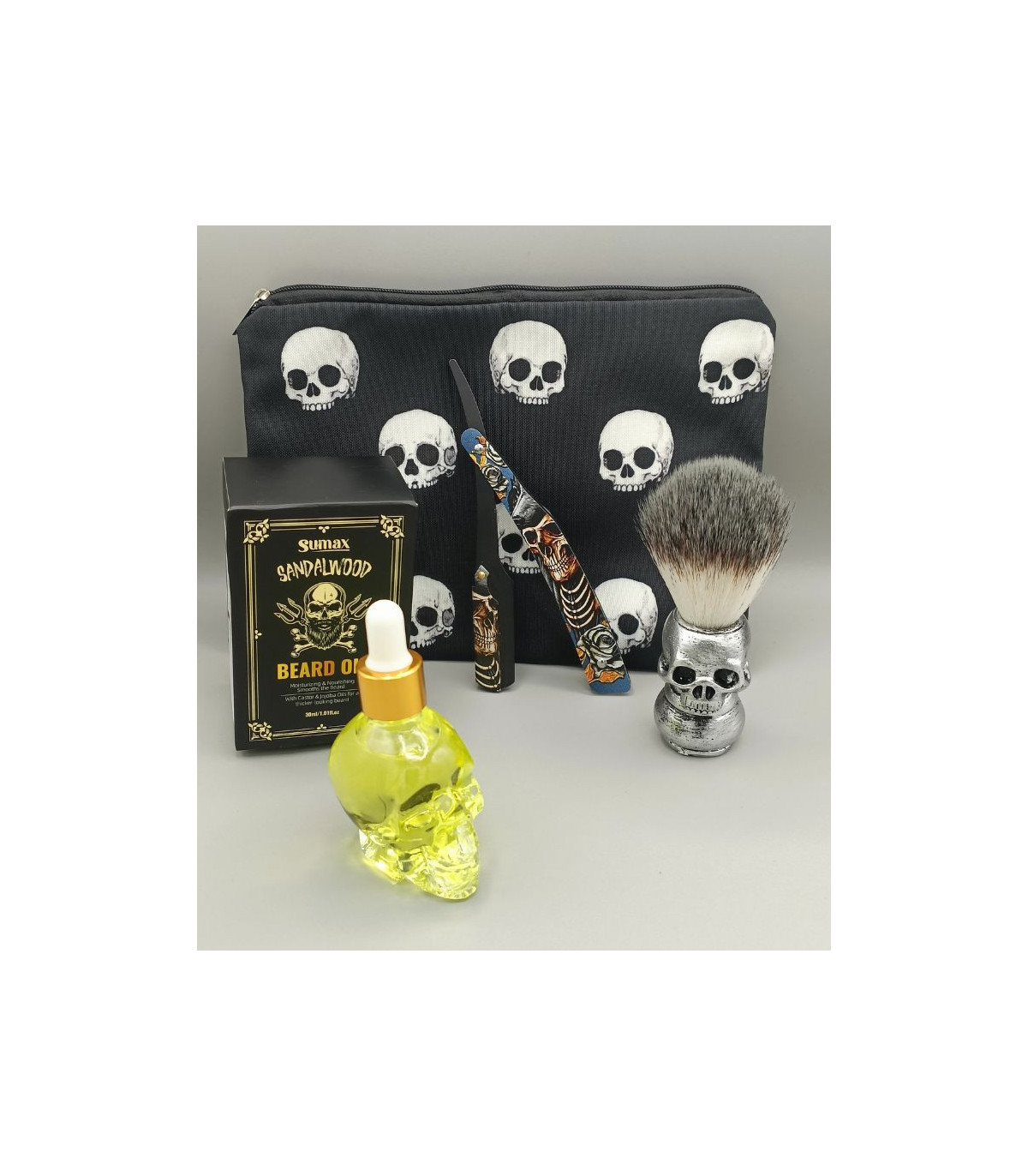 Kit de Afeitado Calavera Navaja, Brocha, Aceite y Neceser SensaBien