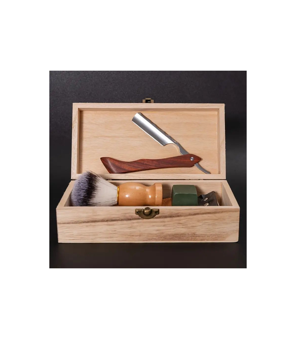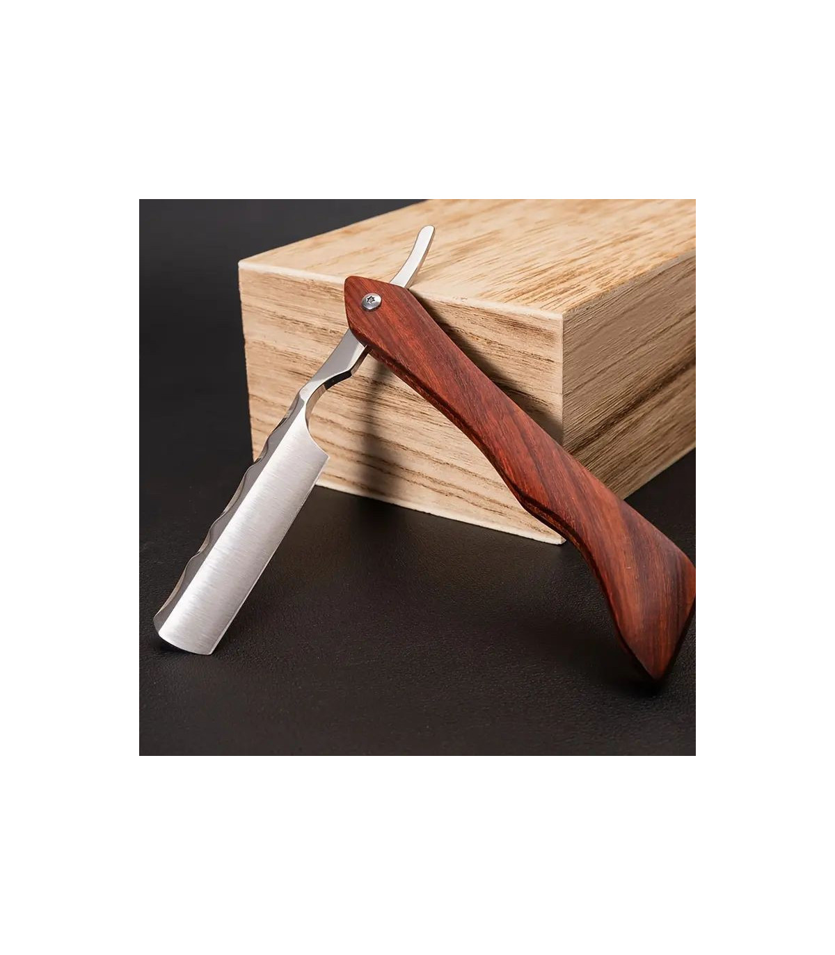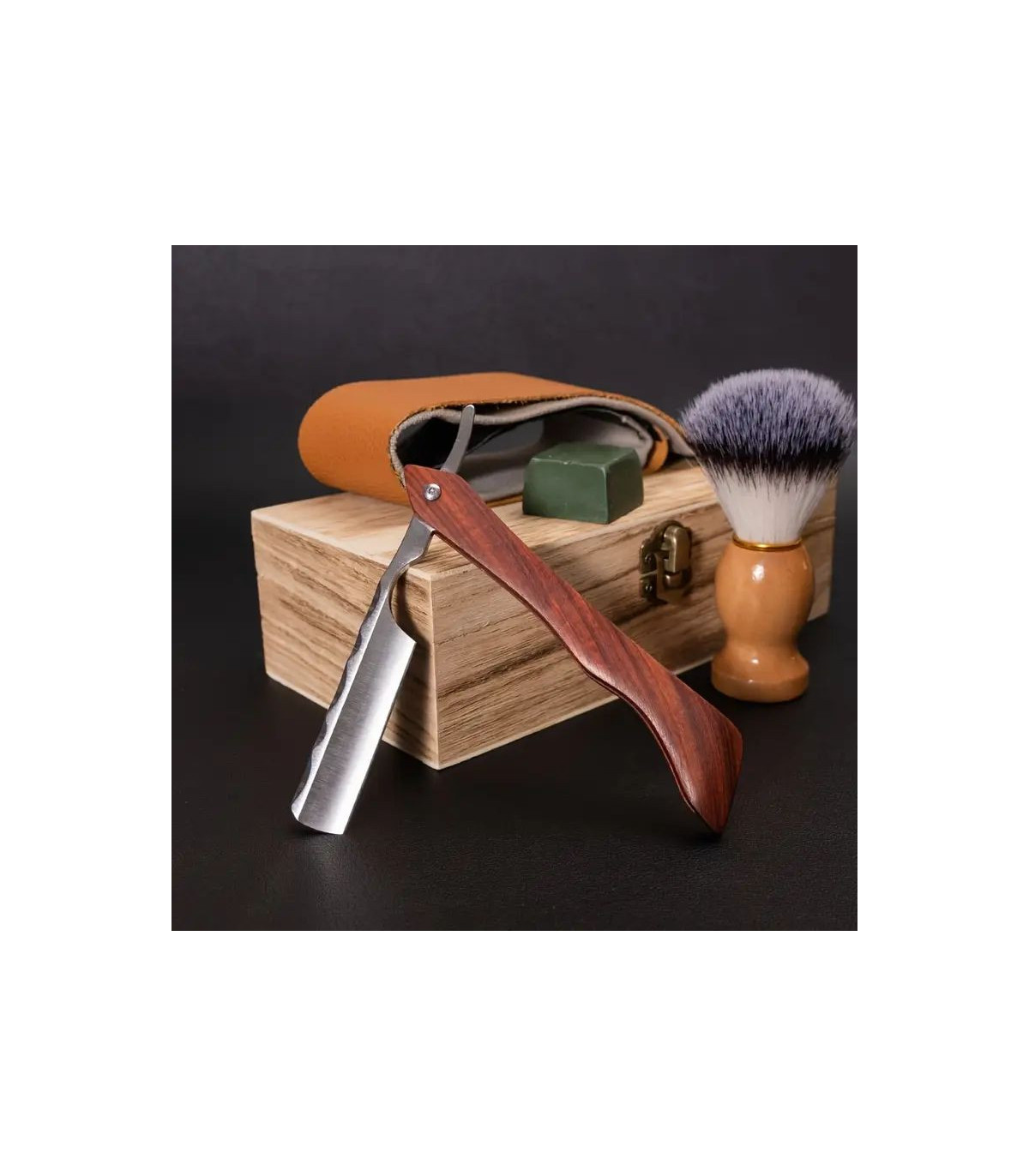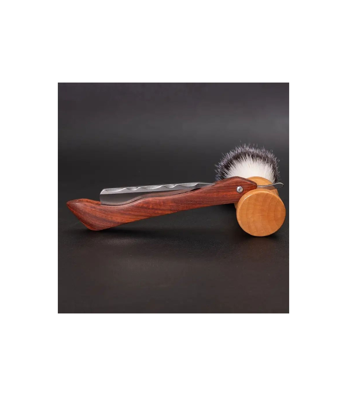 La protagonista del kit es la navaja de afeitar con mango de palo de rosa, una madera noble reconocida por su belleza natural, resistencia y durabilidad.