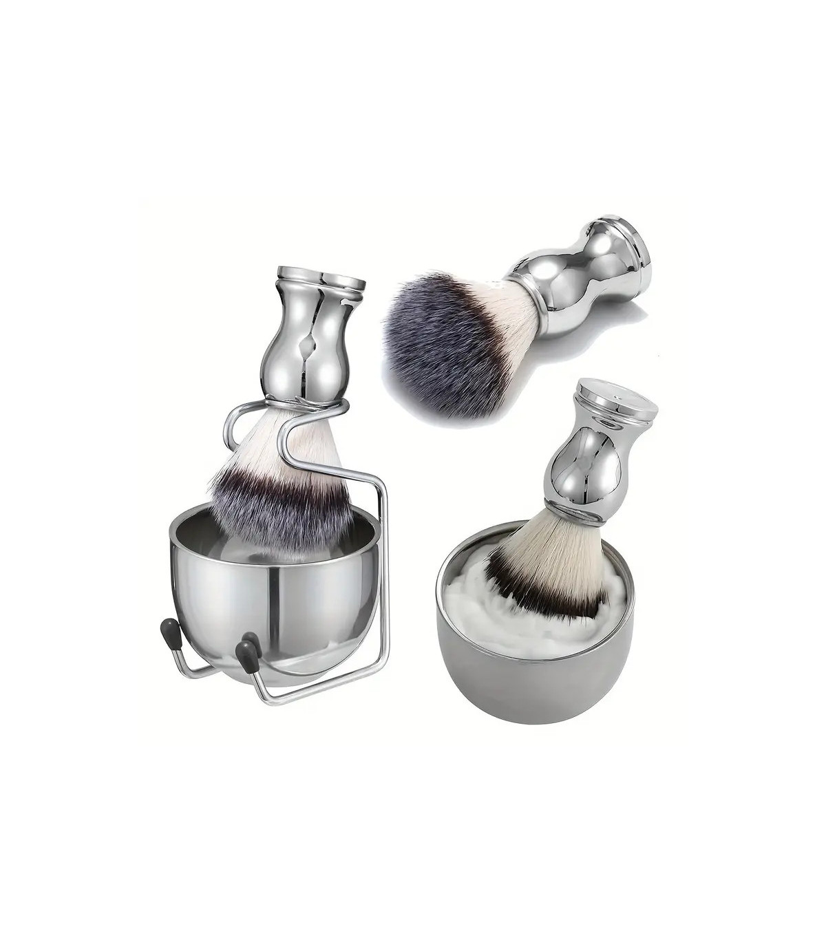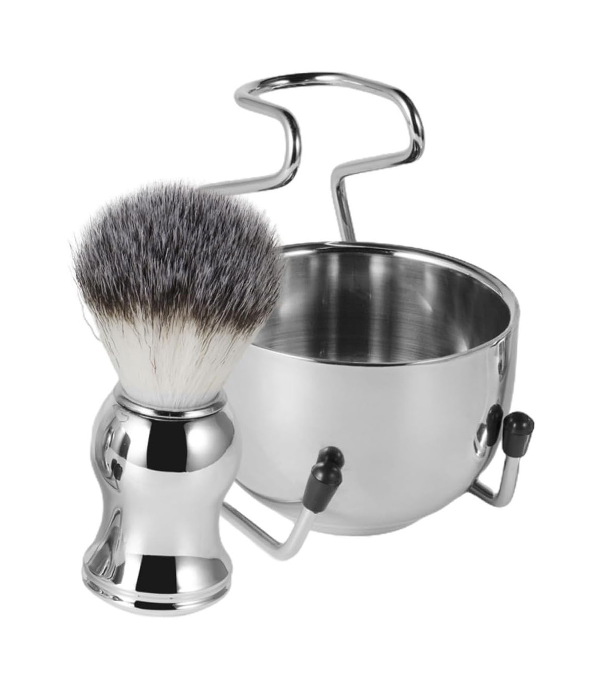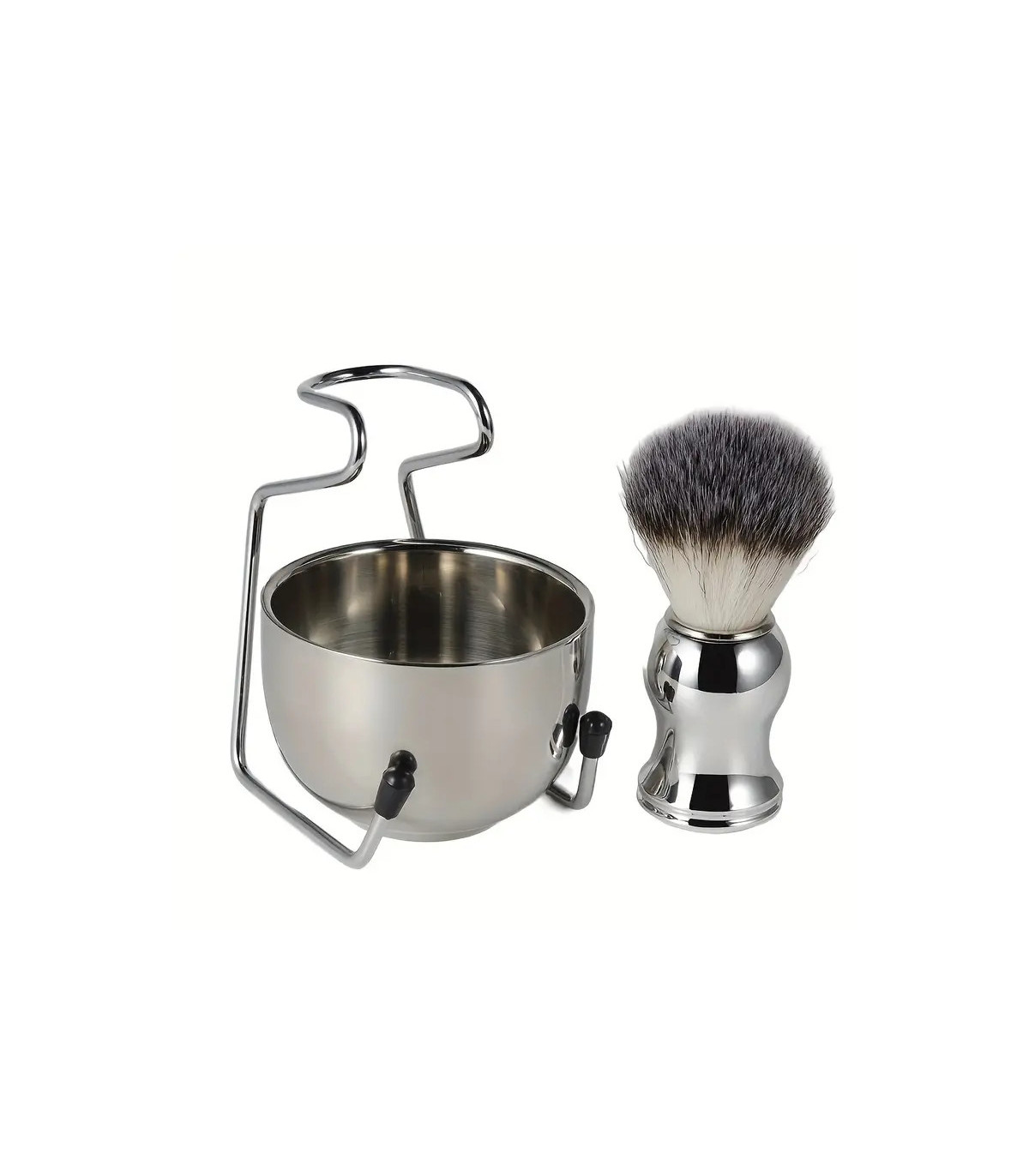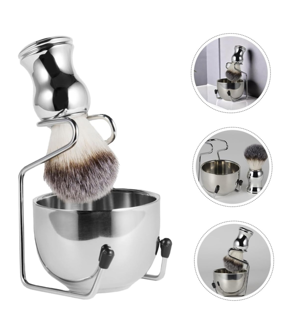 Incluye una brocha sintética, un bol de acero inoxidable para espumar y un soporte estable, todo en acabado plateado brillante que aporta un toque profesional a cualquier baño o set de afeitado.