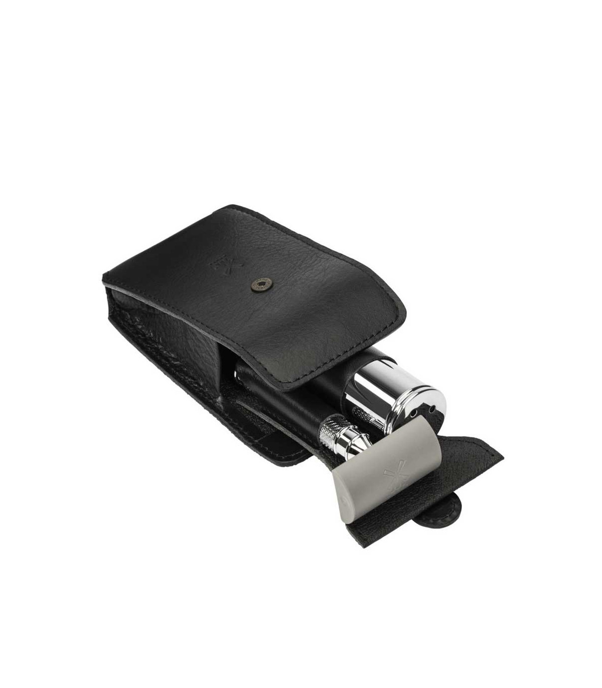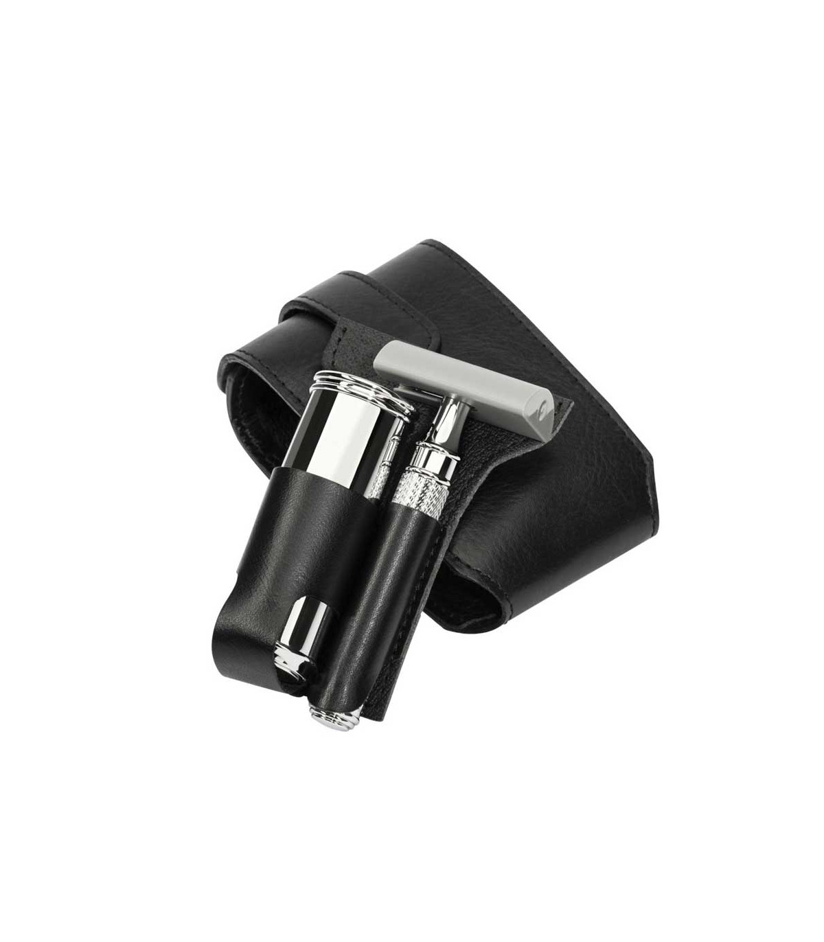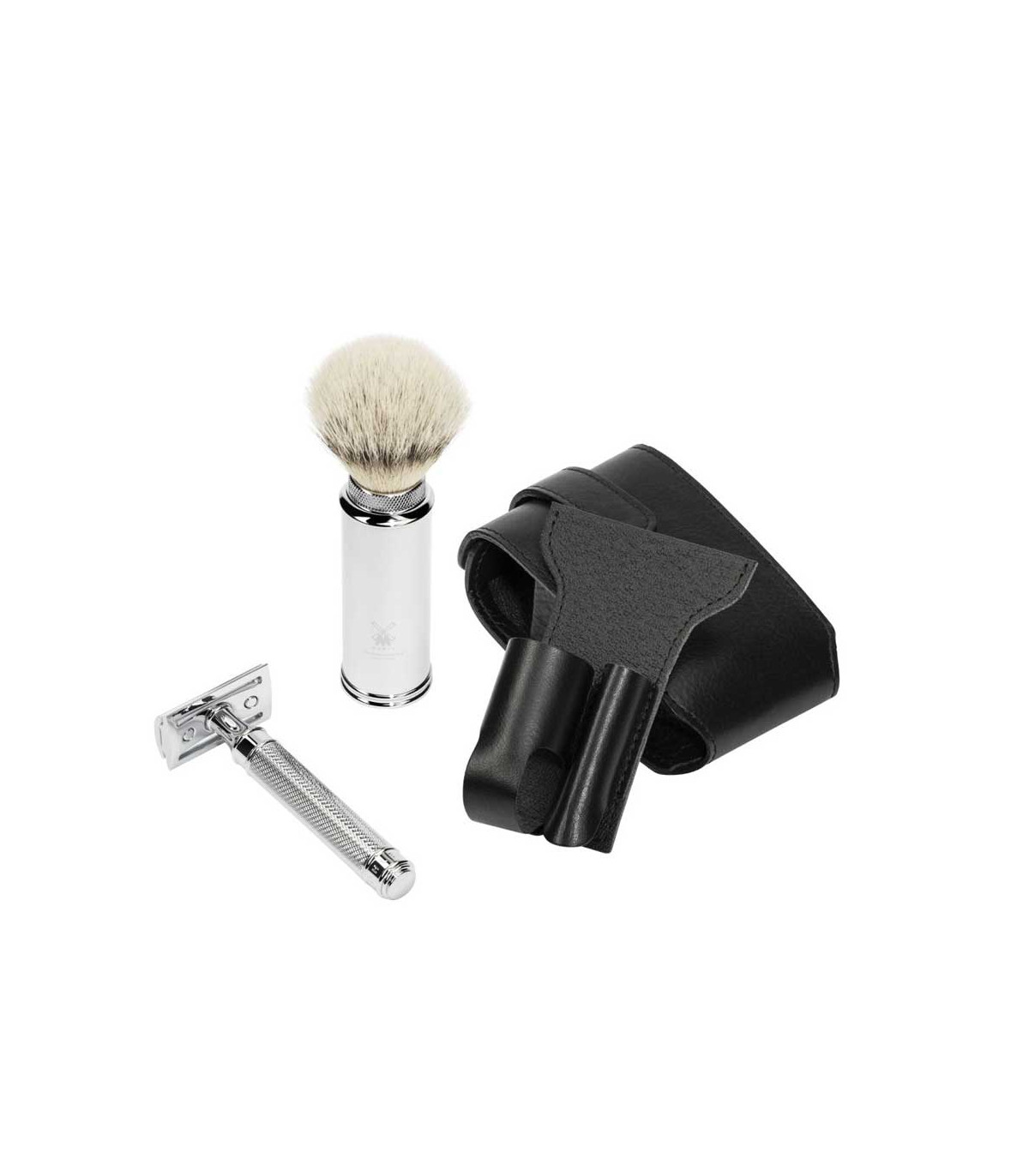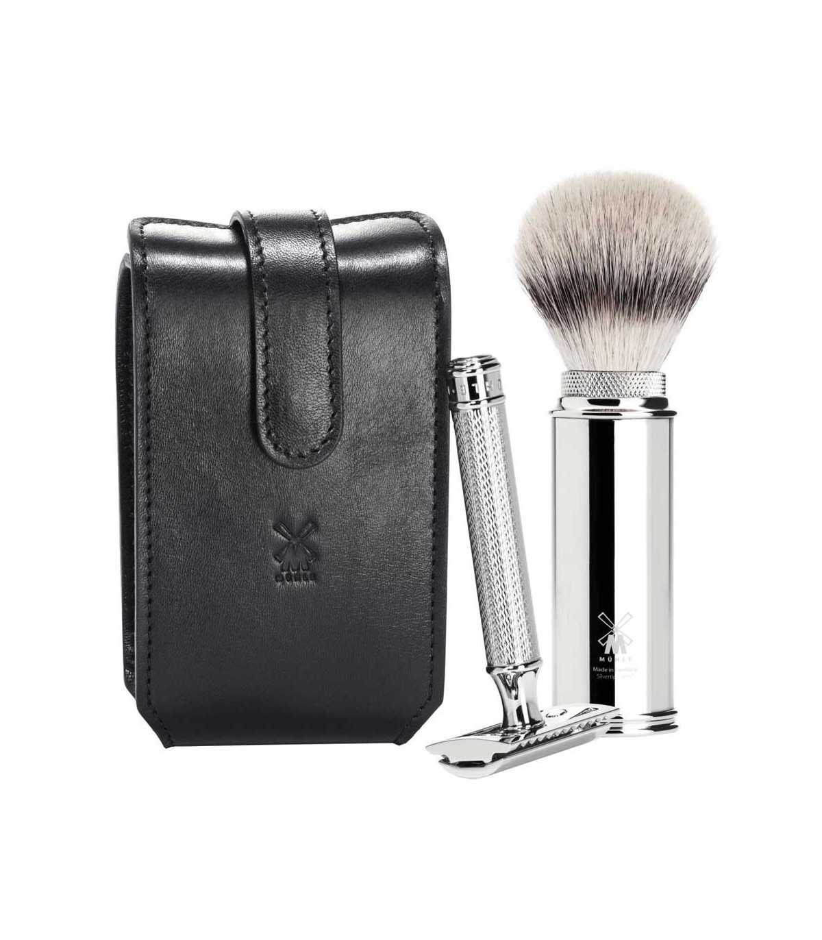 El set de viaje MÜHLE con brocha Silvertip Fibre® y maquinilla clásica de peine cerrado R89 en estuche de piel negra está diseñado para quienes necesitan mantener su rutina de afeitado con un formato práctico y bien organizado.