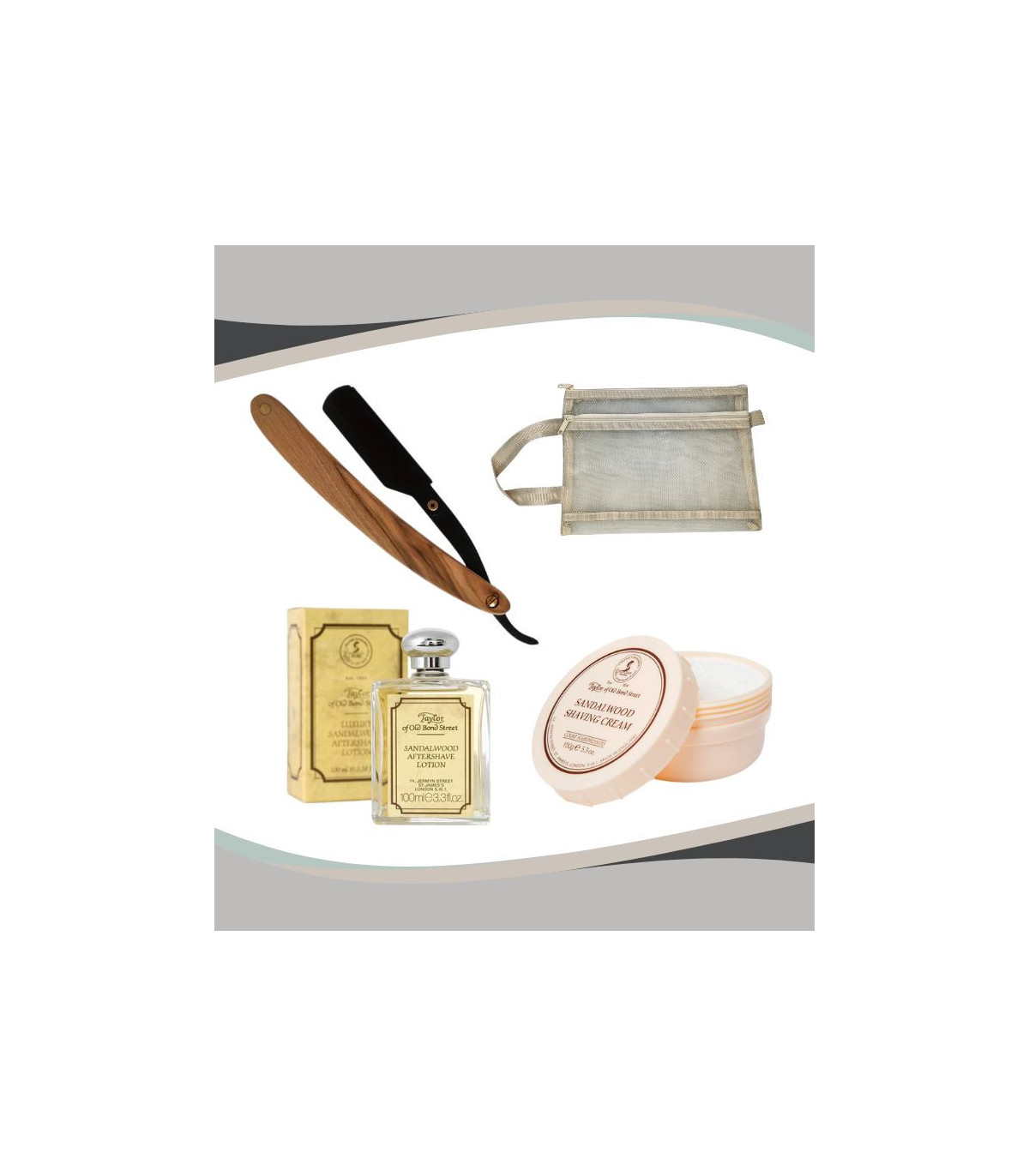 Un pack exclusivo de afeitado con aroma a sándalo, crema premium, aftershave sin alcohol, navaja de olivo y neceser de regalo.