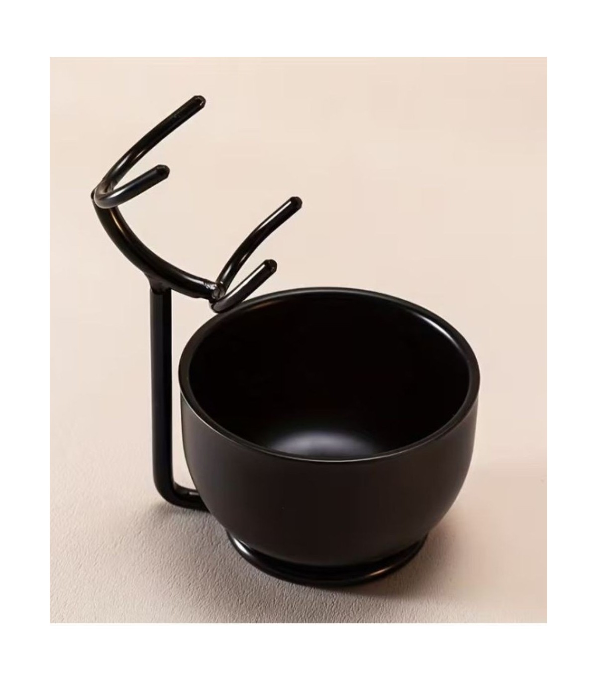 El contraste entre el mango efecto cuerno y el negro mate del soporte y bol crea una combinación sobria y distinguida.