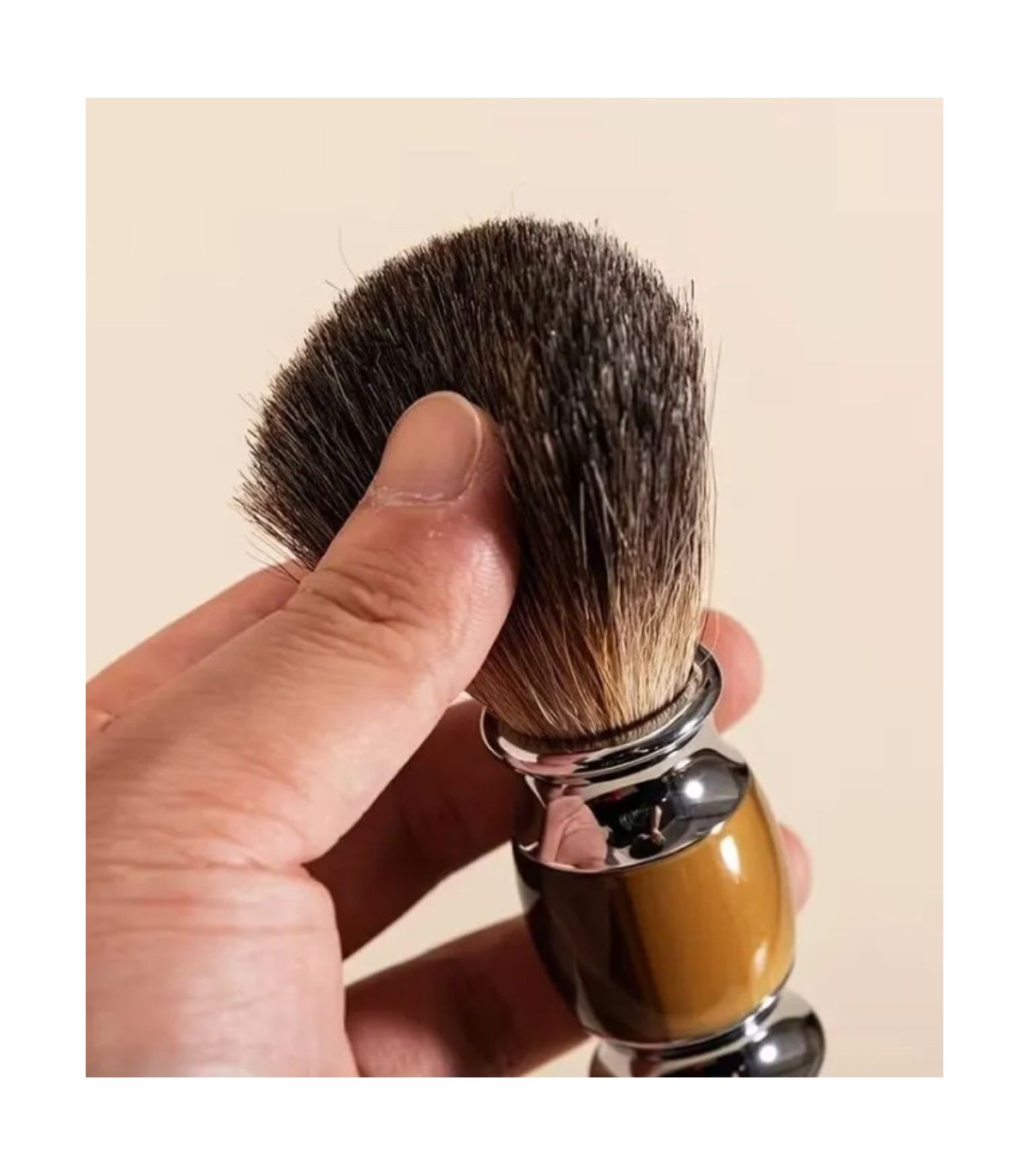 La brocha incorpora pelo de tejón puro, reconocido por su suavidad natural y buena retención de agua.