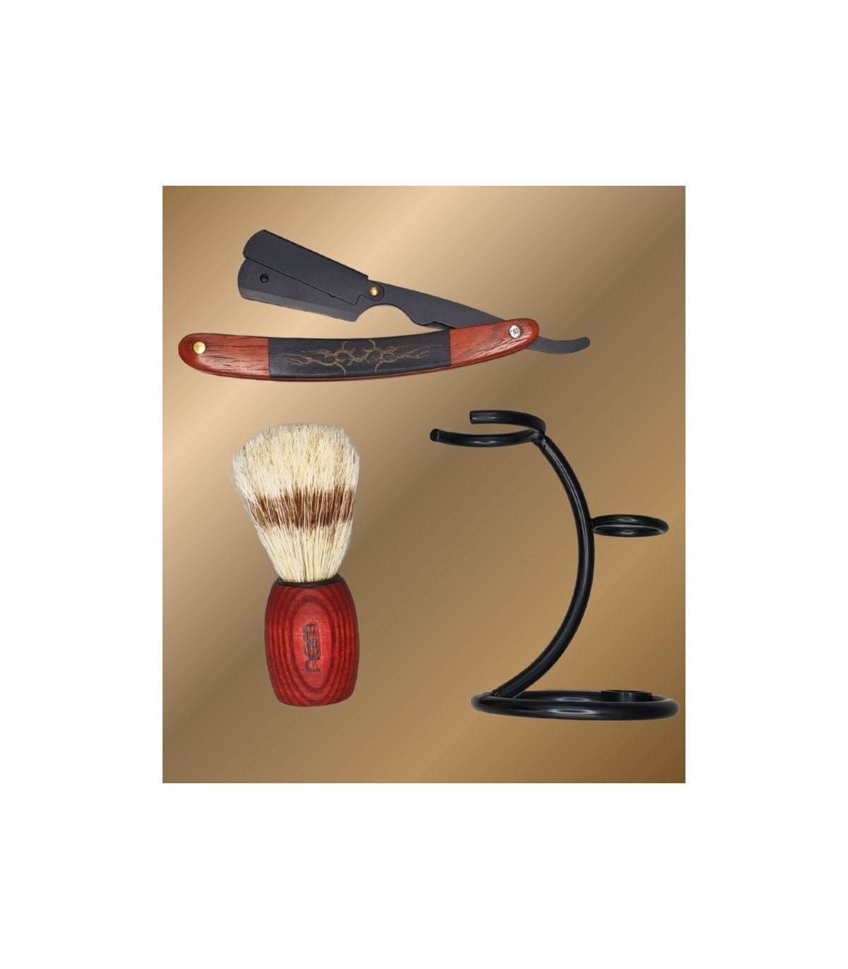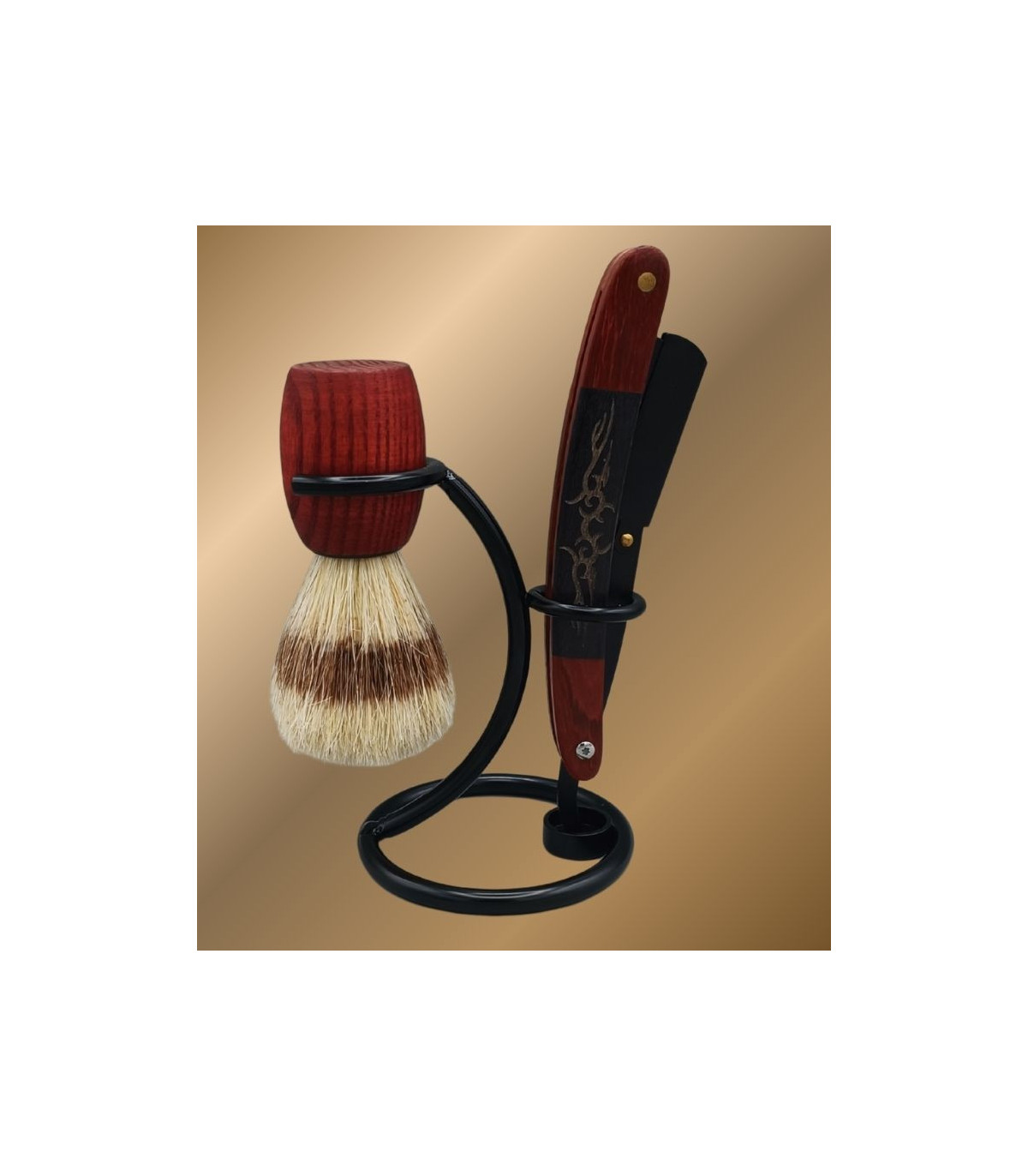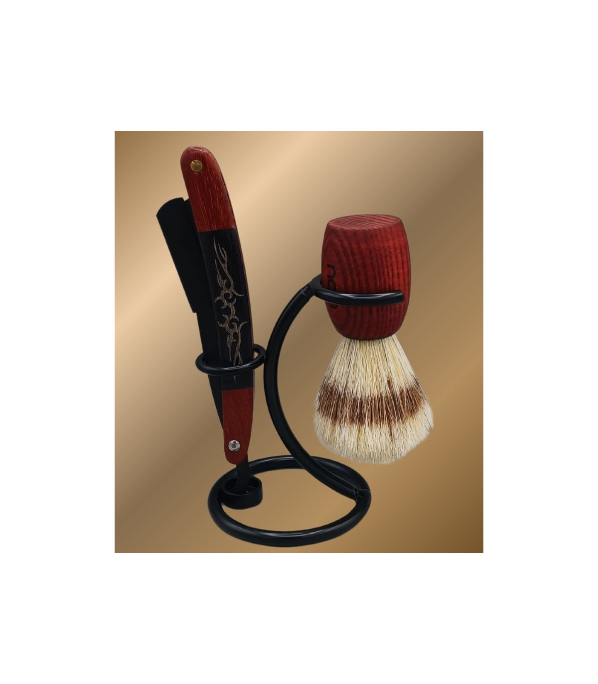 El conjunto se completa con un soporte metálico negro, diseñado para mantener la brocha y la navaja en posición vertical. Esto favorece un secado correcto, mejora la higiene y aporta orden al espacio de afeitado. Su acabado negro encaja perfectamente con la madera y refuerza el carácter elegante del set.