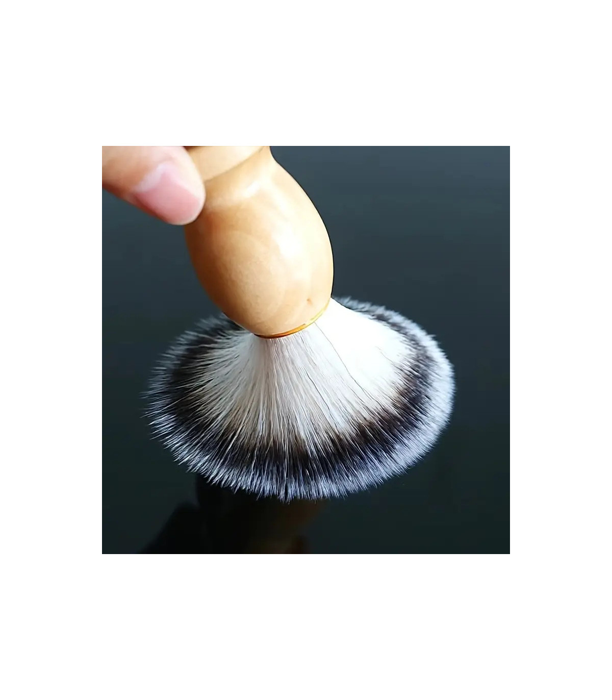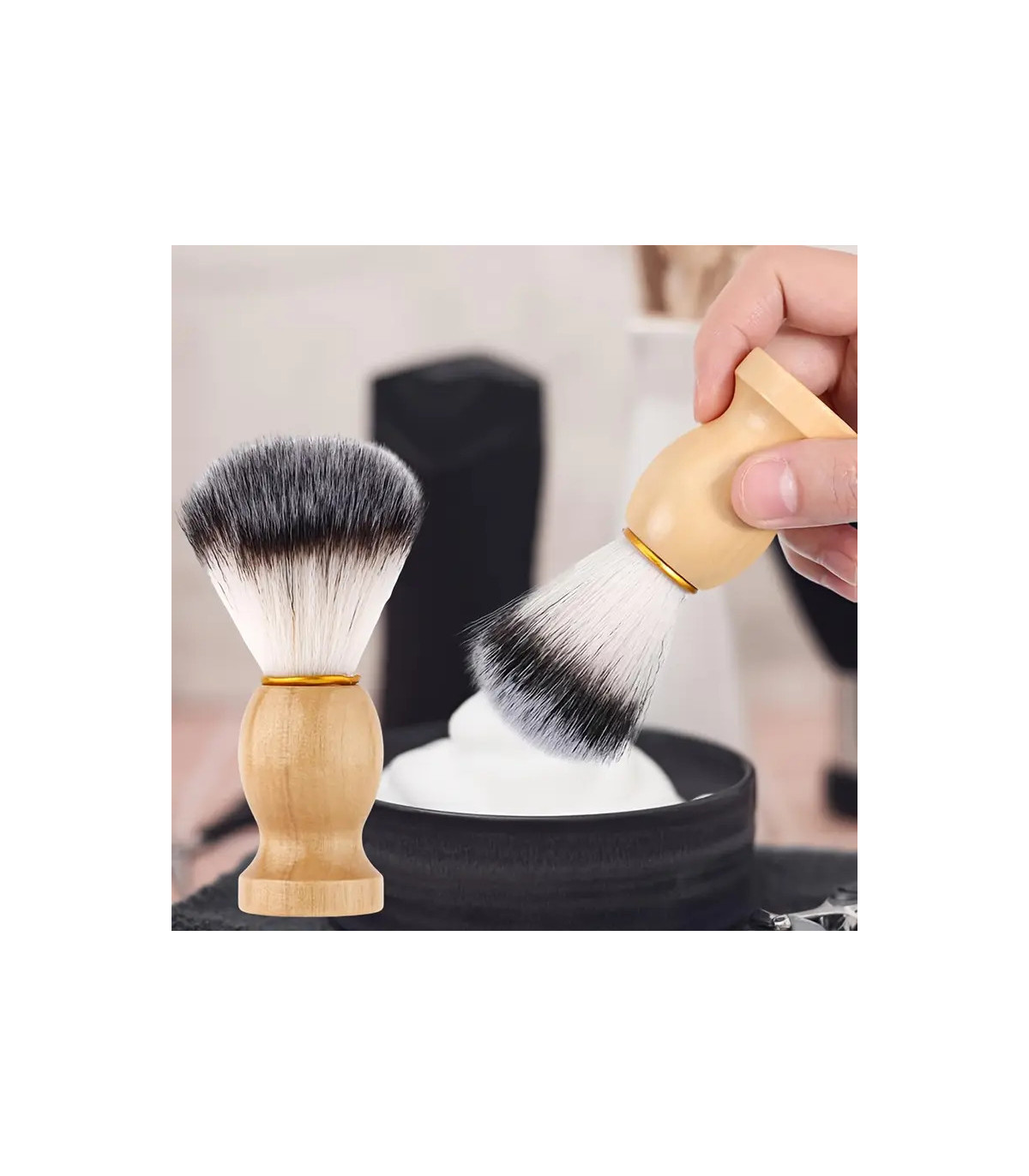 El pack incluye además una brocha de afeitar de madera con cerdas suaves bicolor, con un mango ergonómico de 10,5 cm de altura, diseñada para levantar el vello y repartir la espuma de manera uniforme. Su combinación de firmeza y suavidad la hace ideal tanto para principiantes como para expertos del afeitado clásico.