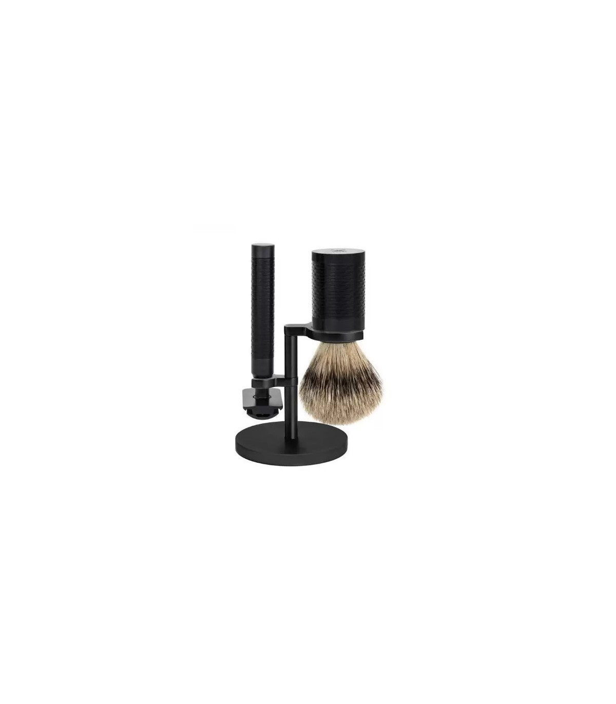 Revestimiento de Carbono Diamantado · Brocha Silverspitz (tejón punta plata) · Maquinilla Clásica Peine Cerrado y Soporte