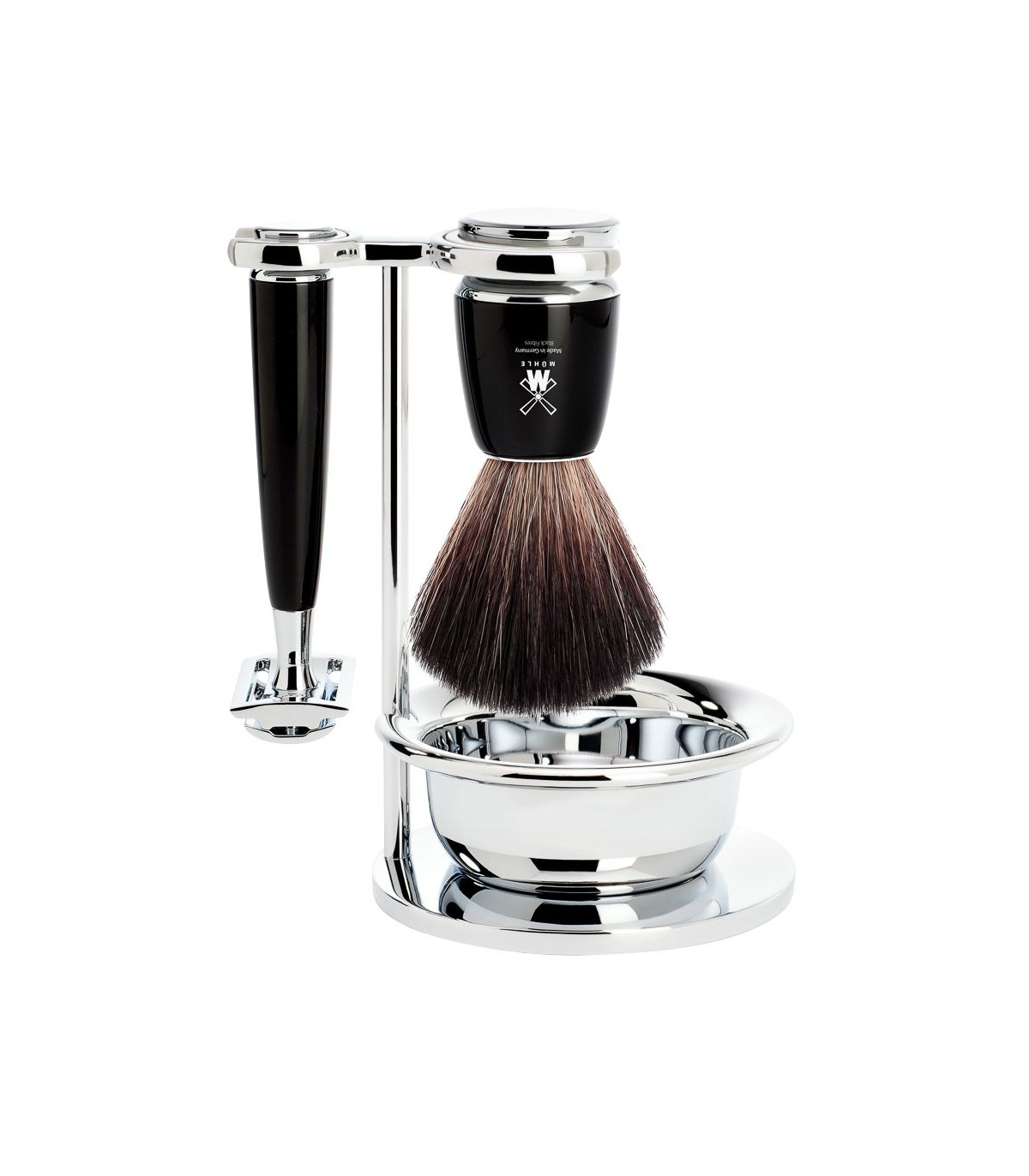 Set de Afeitado Mühle Rytmo Maquinilla de Afeitar Clásica Peine Cerrado, Brocha Sintética Fibra Negra, Soporte y Bol Jabonero Resina Negra