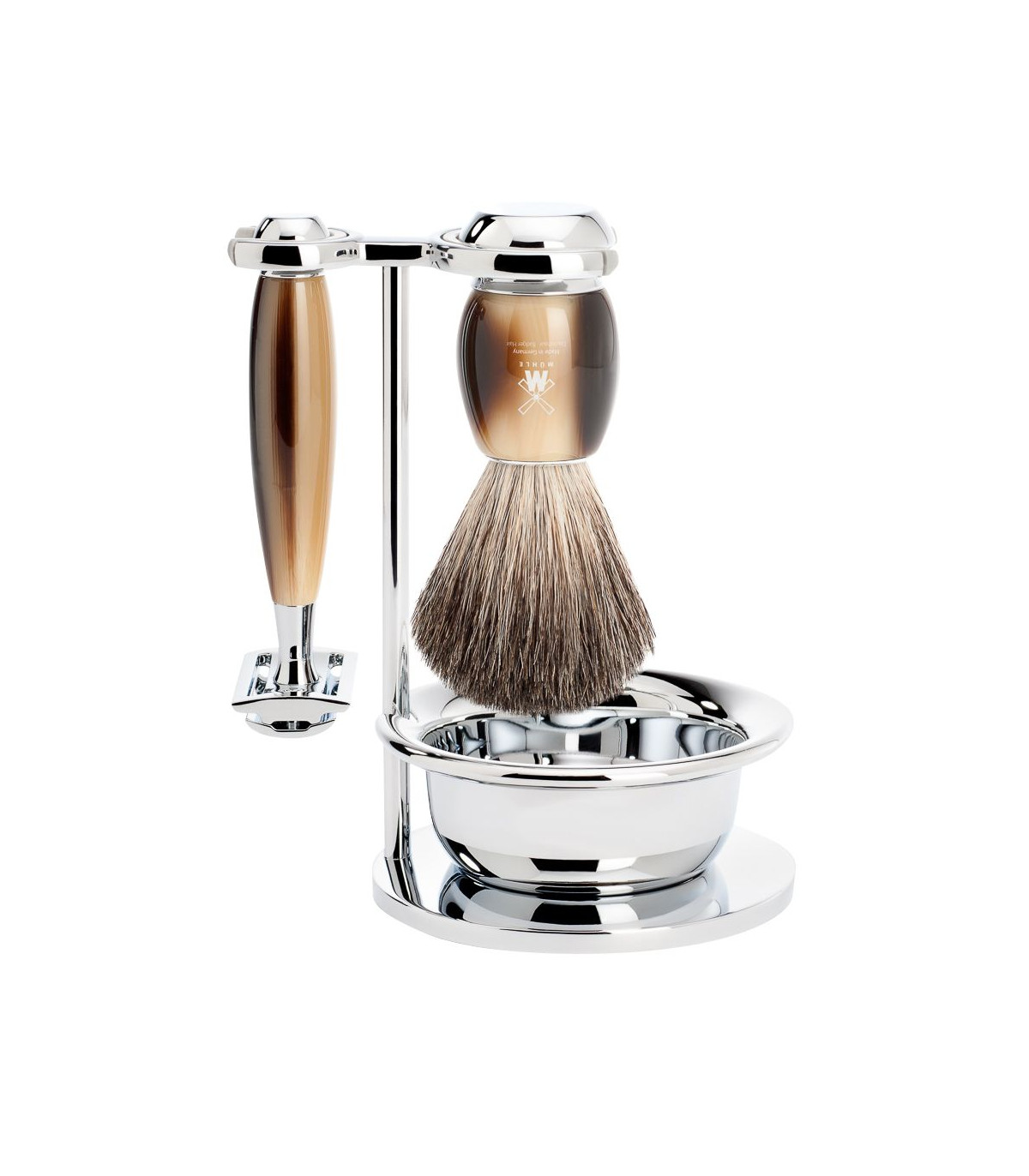 Set de Afeitado Mühle Vivo - Brocha de Tejón Puro, Maquinilla Clásica y Bol en Cuerno Marrón