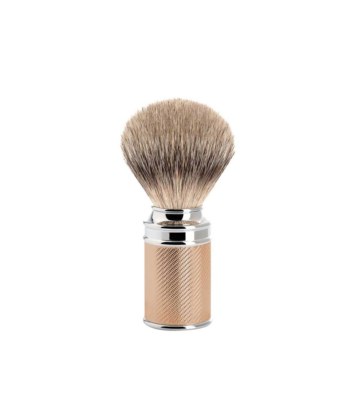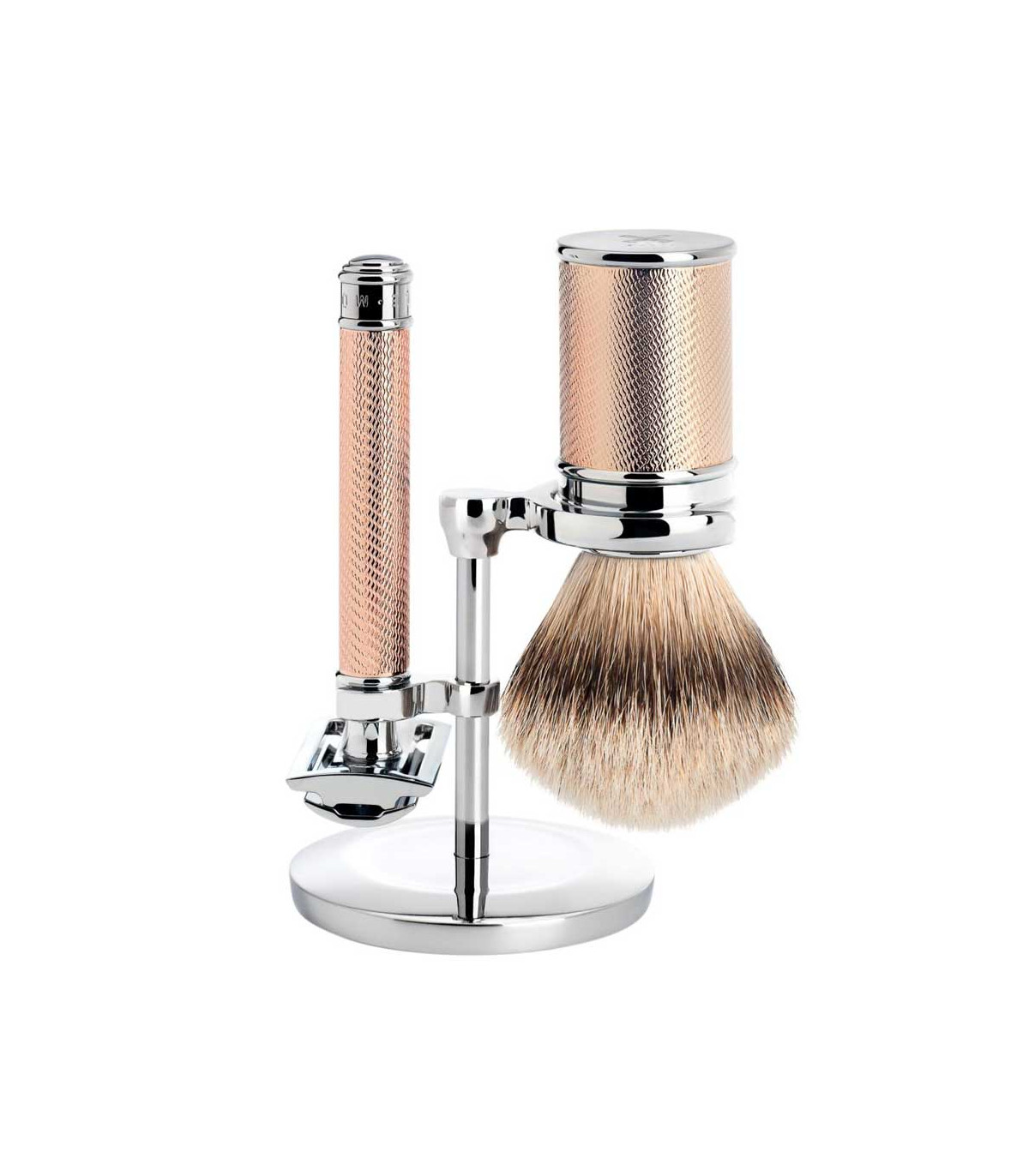 Set de Afeitado Mühle Traditional - Brocha de Tejón Punta Plata, Maquinilla Clásica y Soporte en Oro Rosa