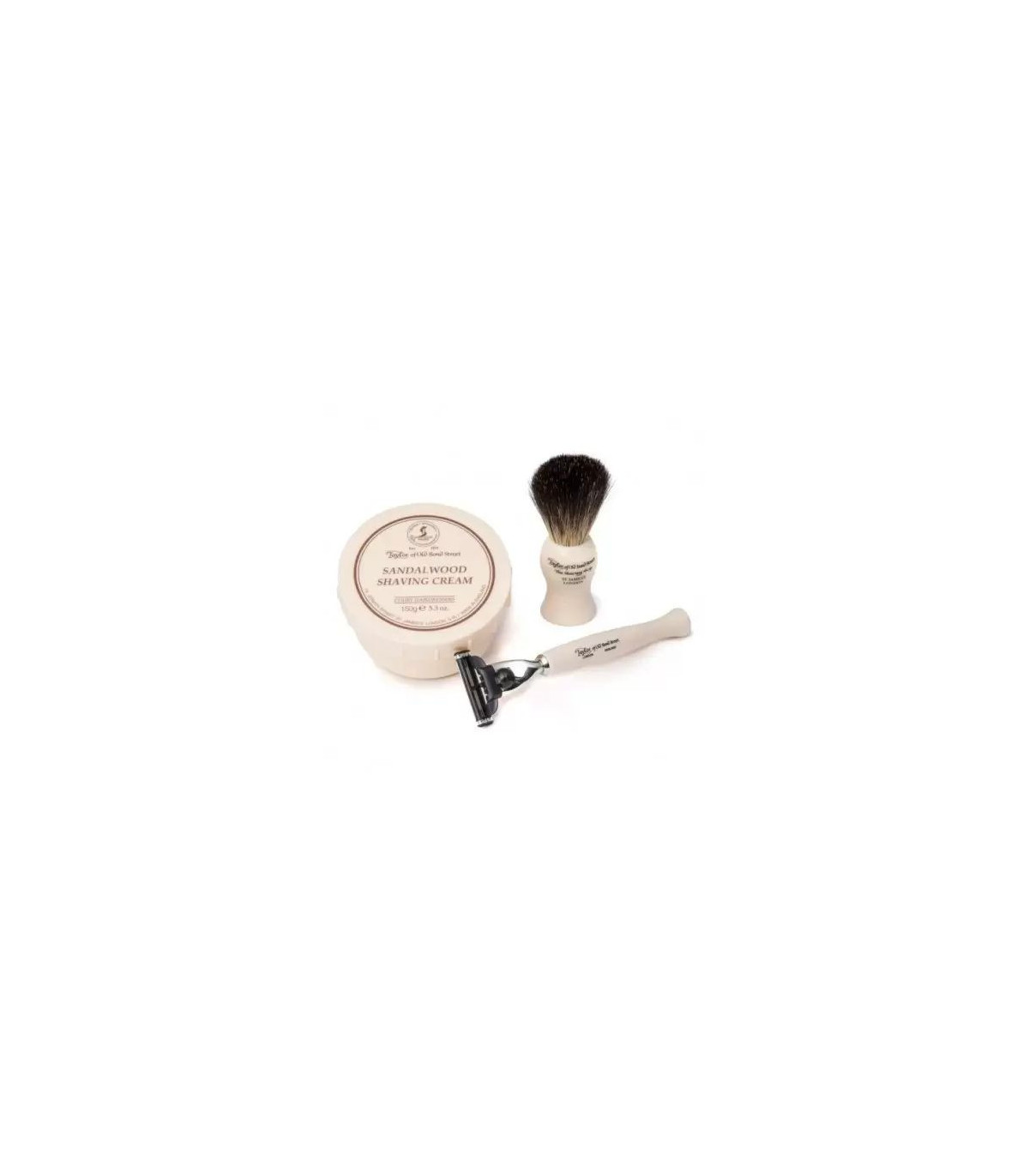 Una crema de afeitar de sándalo de 150g, una brocha de tejón puro y una maquinilla Mach3.