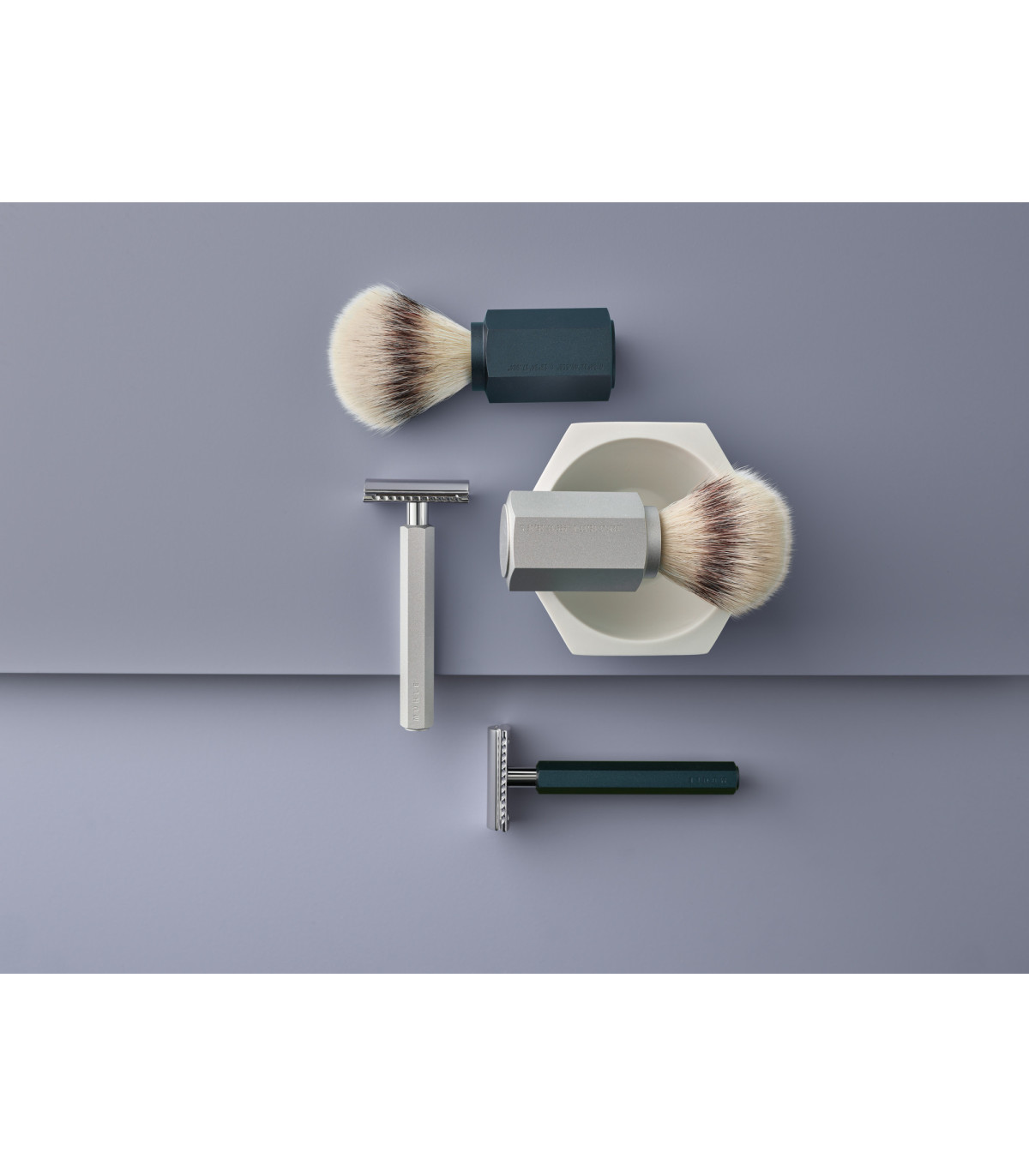 La excelencia del afeitado también se aprecia en los pequeños detalles. El Bol de Afeitado Hexagon de porcelana blanca de MÜHLE forma parte de la prestigiosa colección HEXAGON, fruto de la colaboración con el reconocido diseñador berlinés Mark Braun. Su distintivo diseño de seis lados no es solo una declaración estética: garantiza un agarre cómodo, ergonómico y antideslizante durante el espumado.